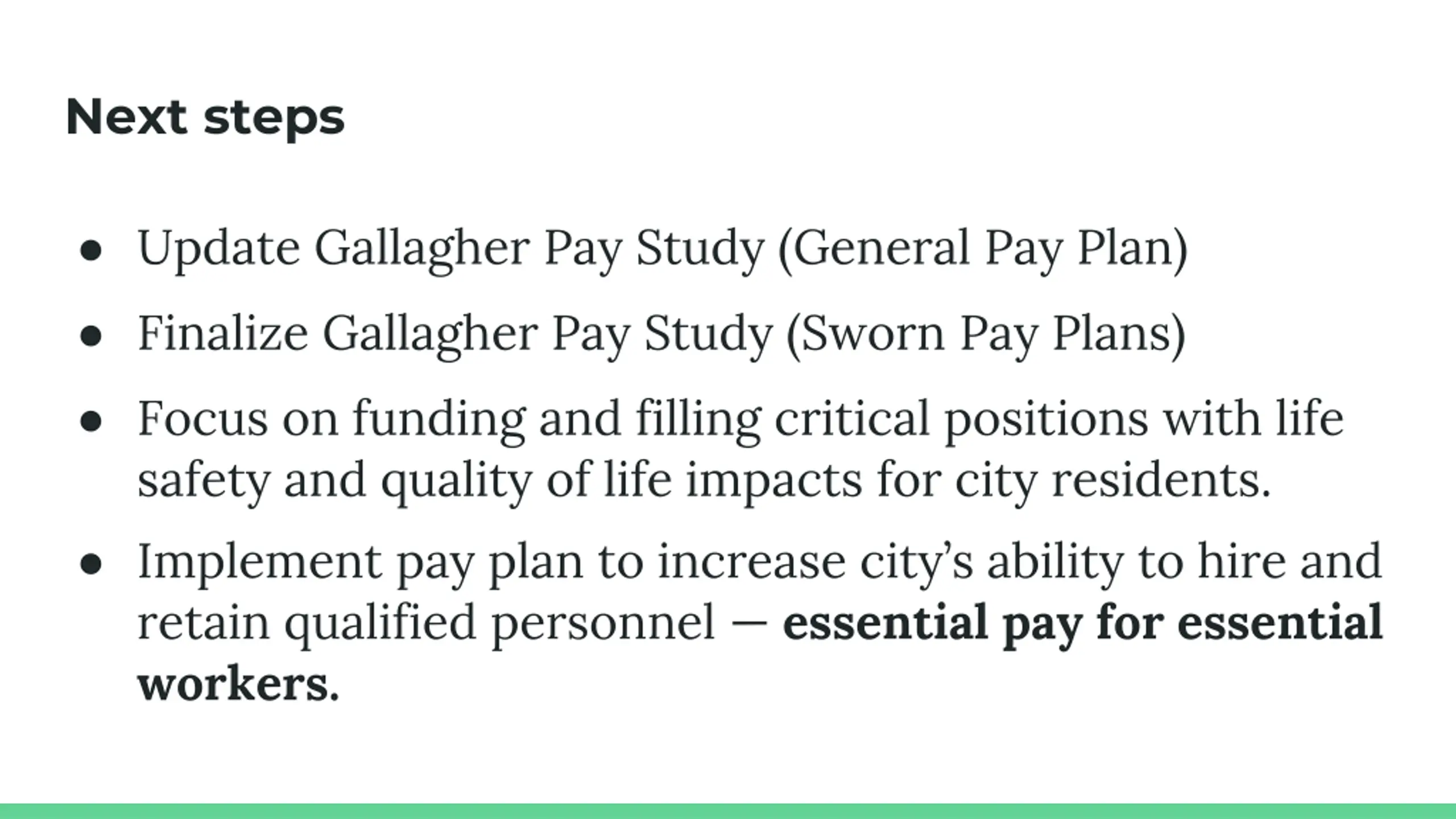 Next steps Update Gallagher Pay Study (General Pay Plan) Finalize Gallagher Pay Study (Sworn Pay Plans) Focus on funding and filling critical positions with life safety and quality of life impacts for city residents. Implement pay plan to increase city s ability to hire and retain qualified personnel essential pay for essential workers.