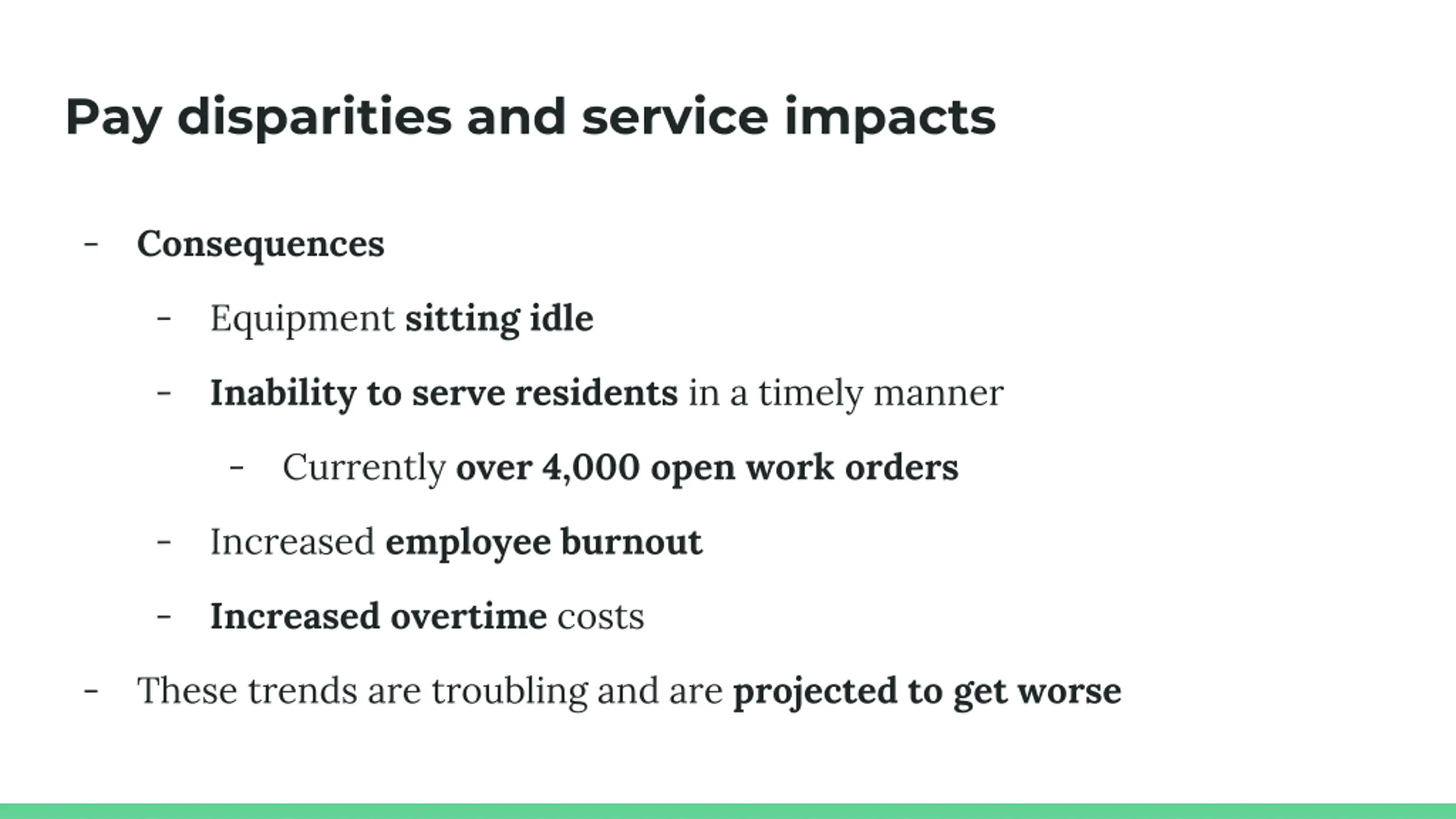 Pay disparities and service impacts - Consequences - Equipment sitting idle - Inability to serve residents in a timely manner - Currently over 4,000 open work orders - Increased employee burnout - Increased overtime costs - These trends are troubling and are projected to get worse