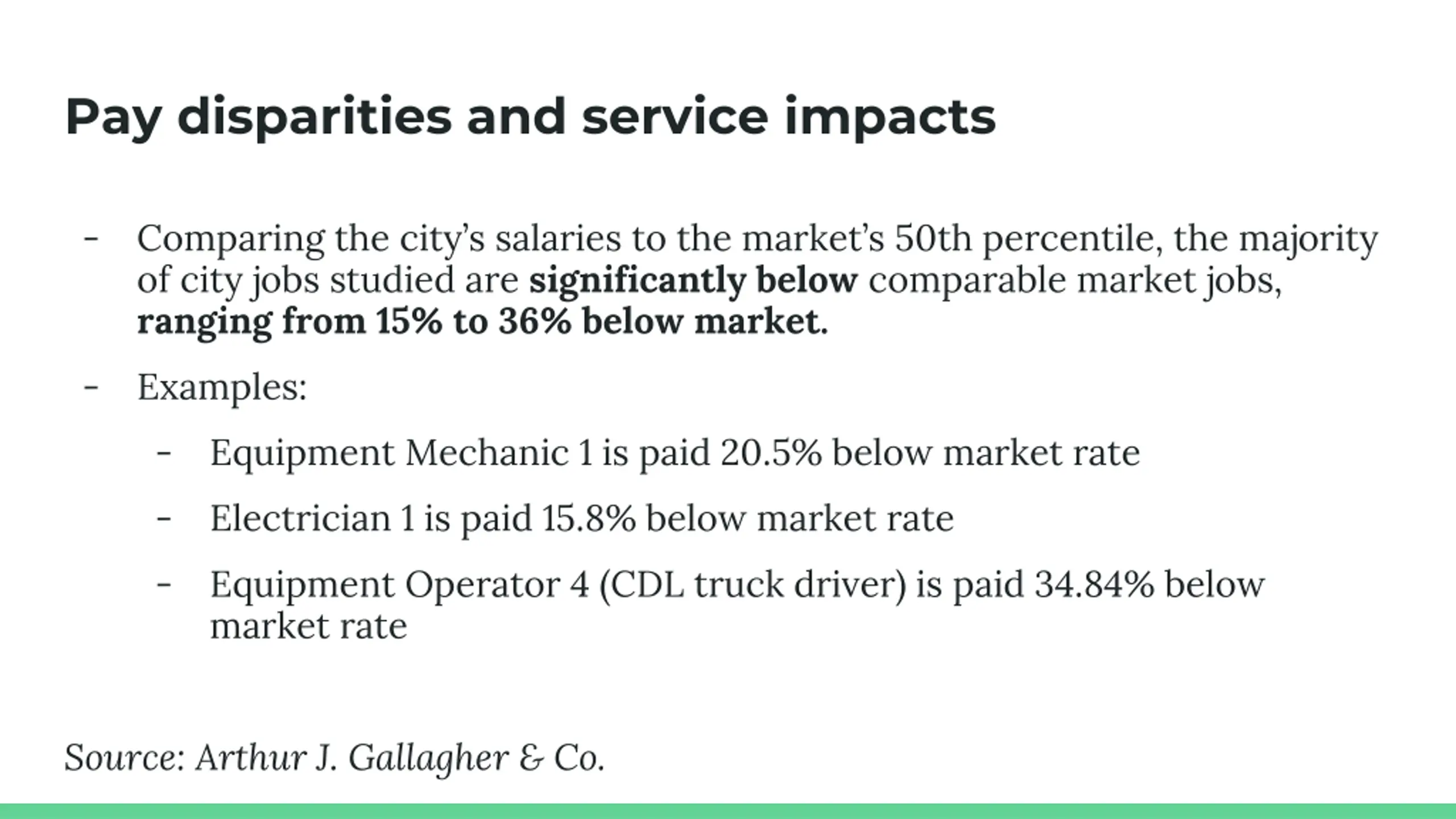 Pay disparities and service impacts - Comparing the city s salaries to the market s 50th percentile, the majority of city jobs studied are significantly below comparable market jobs, ranging from 15% to 36% below market. - Examples: - Equipment Mechanic 1 is paid 20.5% below market rate - Electrician 1 is paid 15.8% below market rate - Equipment Operator 4 (CDL truck driver) is paid 34.84% below market rate Source: Arthur J. Gallagher & Co.