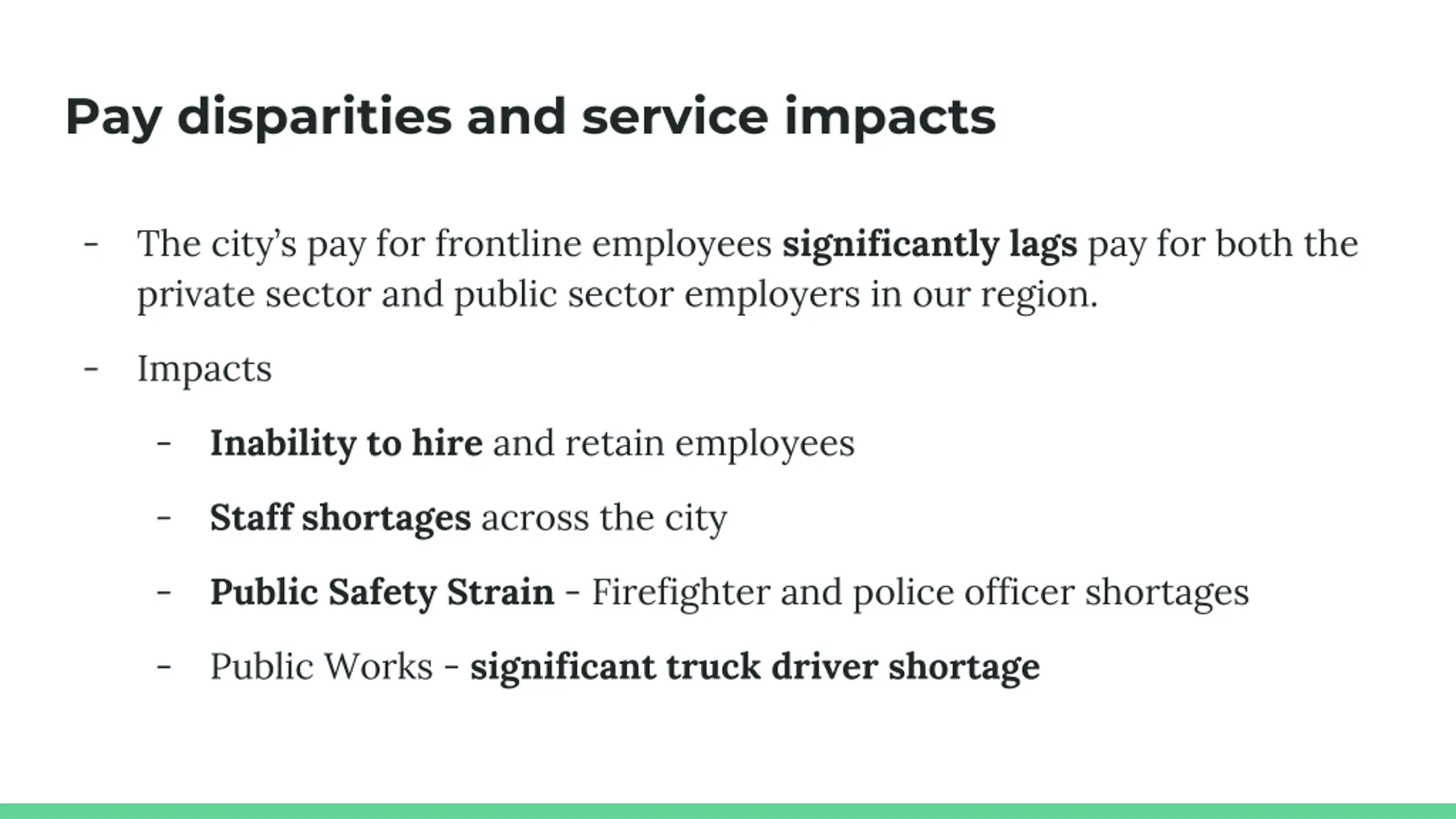Pay disparities and service impacts - The city s pay for frontline employees significantly lags pay for both the private sector and public sector employers in our region. - Impacts - Inability to hire and retain employees - Staff shortages across the city - Public Safety Strain - Firefighter and police officer shortages - Public Works - significant truck driver shortage
