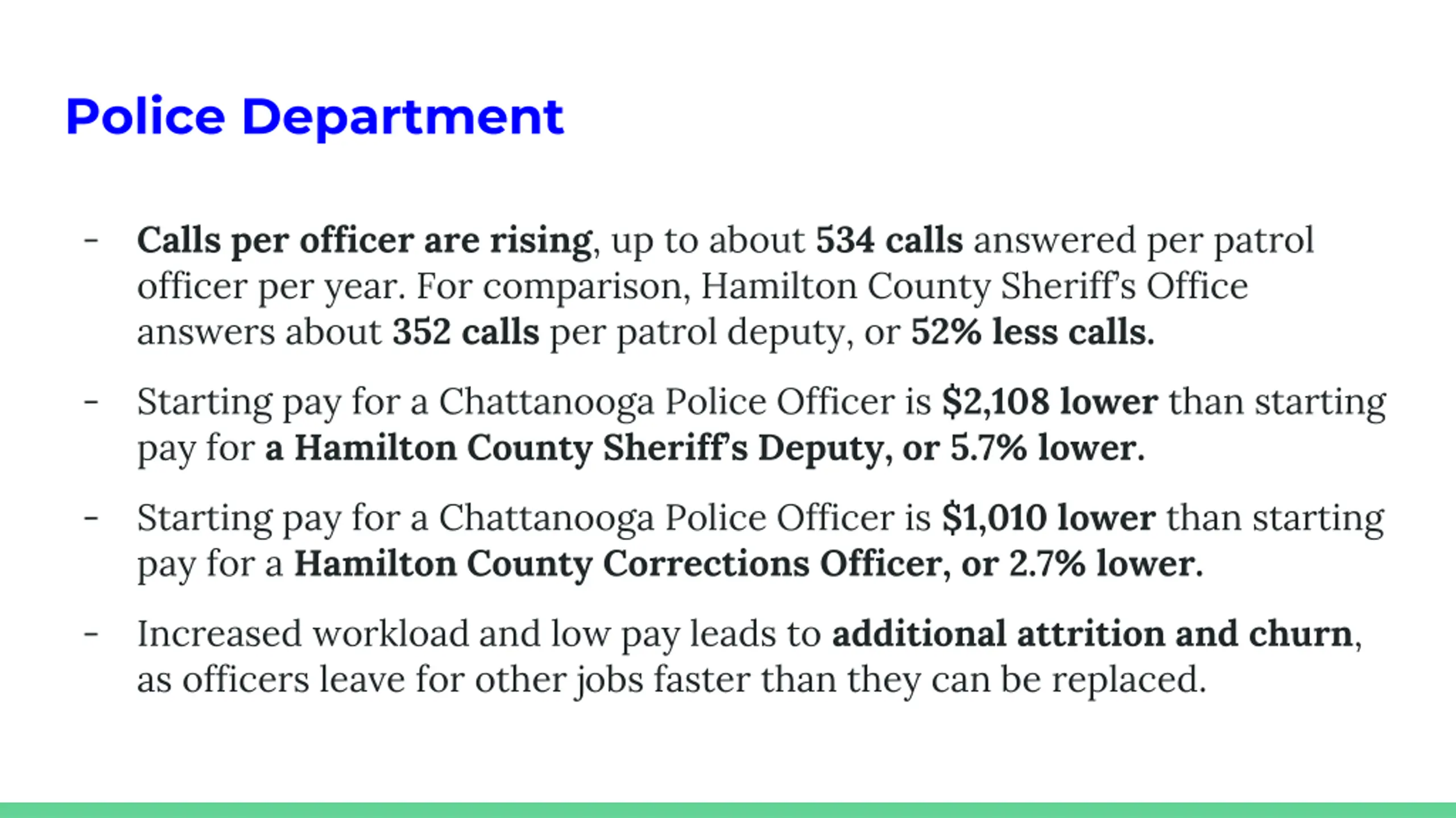 Police Department - Calls per officer are rising, up to about 534 calls answered per patrol officer per year. For comparison, Hamilton County Sheriff s Office answers about 352 calls per patrol deputy, or 52% less calls. - Starting pay for a Chattanooga Police Officer is $2,108 lower than starting pay for a Hamilton County Sheriff s Deputy, or 5.7% lower. - Starting pay for a Chattanooga Police Officer is $1,010 lower than starting pay for a Hamilton County Corrections Officer, or 2.7% lower. - Increased workload and low pay leads to additional attrition and churn, as officers leave for other jobs faster than they can be replaced.