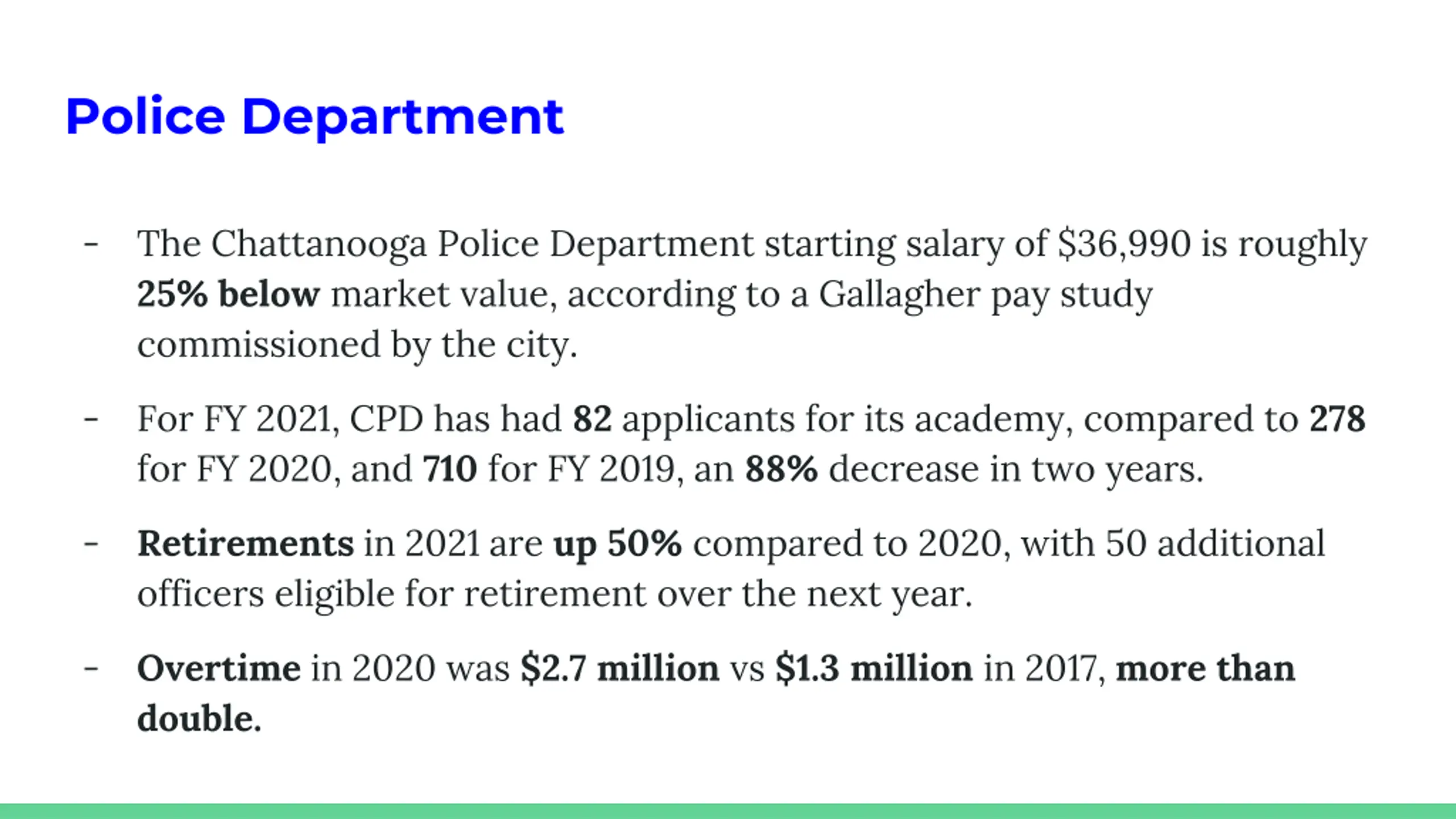 Police Department - The Chattanooga Police Department starting salary of $36,990 is roughly 25% below market value, according to a Gallagher pay study commissioned by the city. - For FY 2021, CPD has had 82 applicants for its academy, compared to 278 for FY 2020, and 710 for FY 2019, an 88% decrease in two years. - Retirements in 2021 are up 50% compared to 2020, with 50 additional officers eligible for retirement over the next year. - Overtime in 2020 was $2.7 million vs $1.3 million in 2017, more than double.