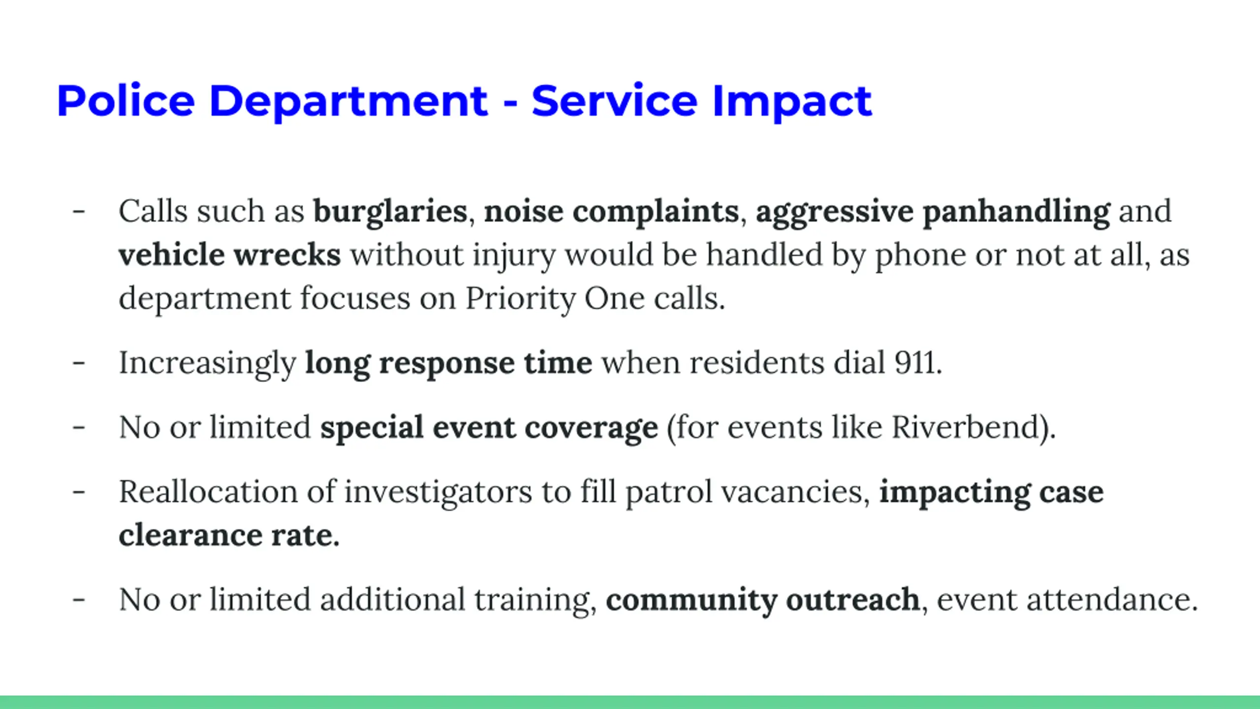 Police Department - Service Impact - Calls such as burglaries, noise complaints, aggressive panhandling and vehicle wrecks without injury would be handled by phone or not at all, as department focuses on Priority One calls. - Increasingly long response time when residents dial 911. - No or limited special event coverage (for events like Riverbend). - Reallocation of investigators to fill patrol vacancies, impacting case clearance rate. - No or limited additional training, community outreach, event attendance.