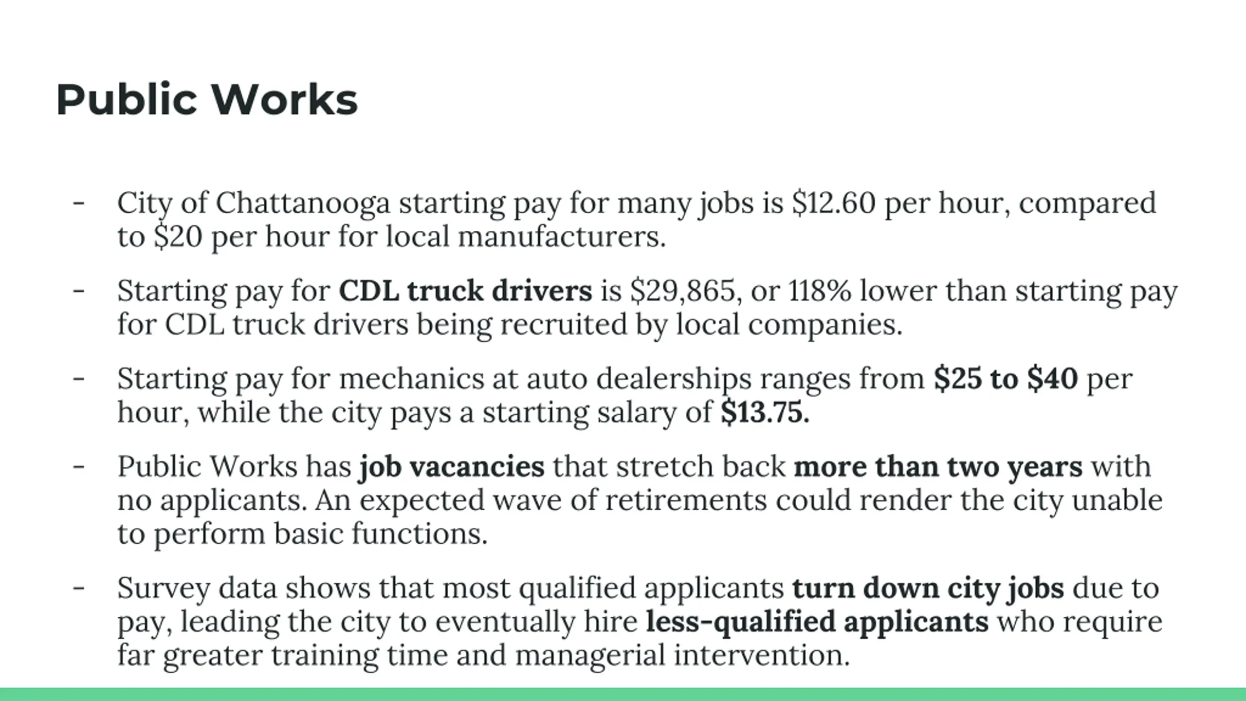 Public Works - City of Chattanooga starting pay for many jobs is $12.60 per hour, compared to $20 per hour for local manufacturers. - Starting pay for CDL truck drivers is $29,865, or 118% lower than starting pay for CDL truck drivers being recruited by local companies. - Starting pay for mechanics at auto dealerships ranges from $25 to $40 per hour, while the city pays a starting salary of $13.75. - Public Works has job vacancies that stretch back more than two years with no applicants. An expected wave of retirements could render the city unable to perform basic functions. - Survey data shows that most qualified applicants turn down city jobs due to pay, leading the city to eventually hire less-qualified applicants who require far greater training time and managerial intervention.