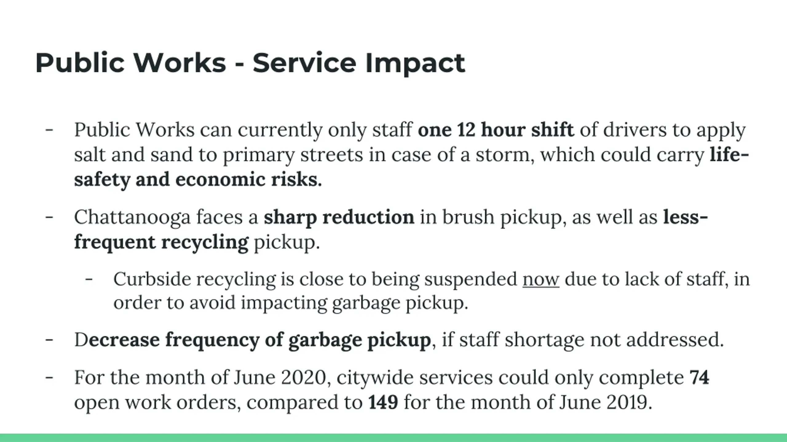 Public Works - Service Impact - Public Works can currently only staff one 12 hour shift of drivers to apply salt and sand to primary streets in case of a storm, which could carry life- safety and economic risks. - Chattanooga faces a sharp reduction in brush pickup, as well as less- frequent recycling pickup. - Curbside recycling is close to being suspended now due to lack of staff, in order to avoid impacting garbage pickup. - Decrease frequency of garbage pickup, if staff shortage not addressed. - For the month of June 2020, citywide services could only complete 74 open work orders, compared to 149 for the month of June 2019.