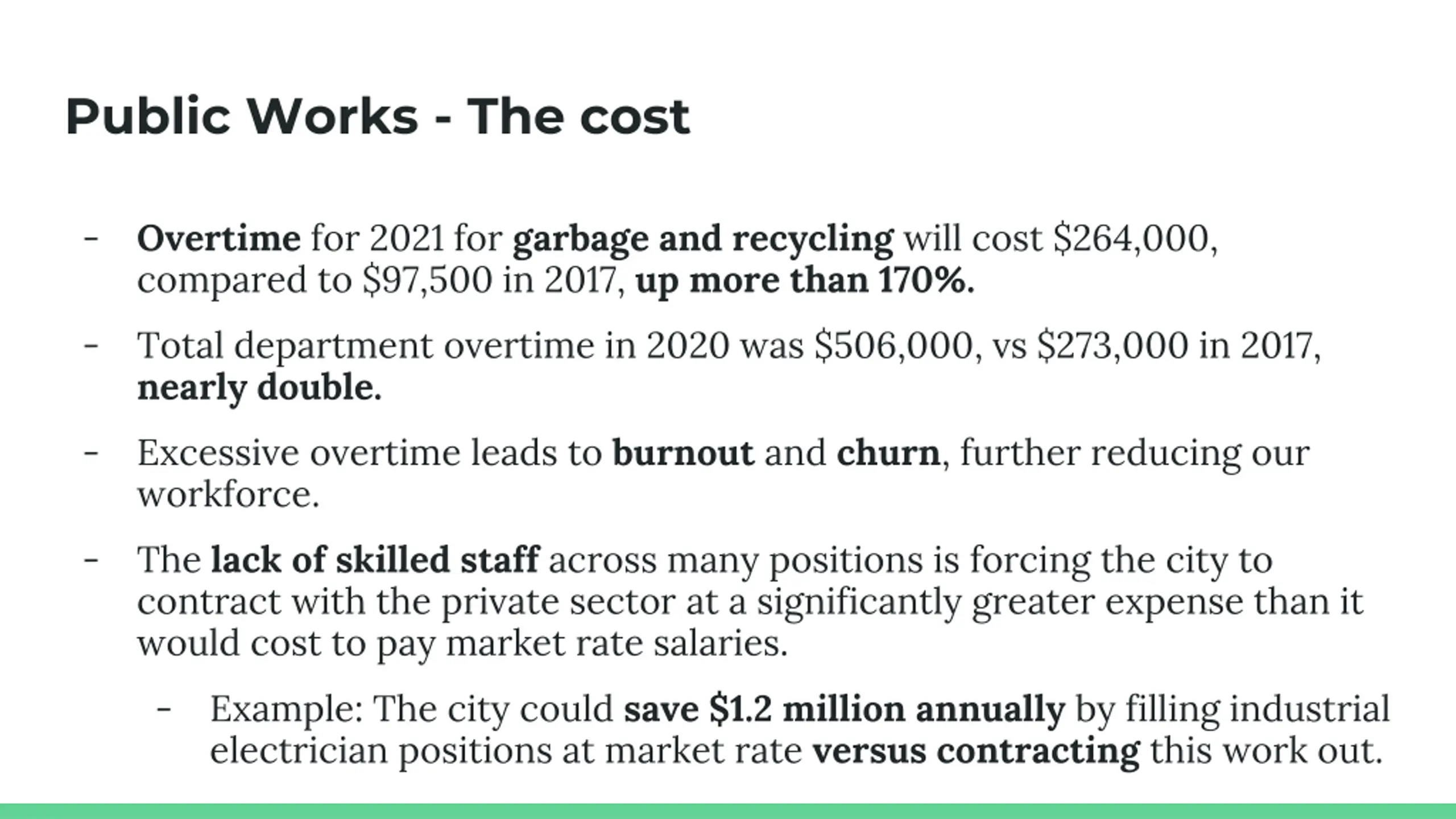 Public Works - The cost - Overtime for 2021 for garbage and recycling will cost $264,000, compared to $97,500 in 2017, up more than 170%. - Total department overtime in 2020 was $506,000, vs $273,000 in 2017, nearly double. - Excessive overtime leads to burnout and churn, further reducing our workforce. - The lack of skilled staff across many positions is forcing the city to contract with the private sector at a significantly greater expense than it would cost to pay market rate salaries. - Example: The city could save $1.2 million annually by filling industrial electrician positions at market rate versus contracting this work out.