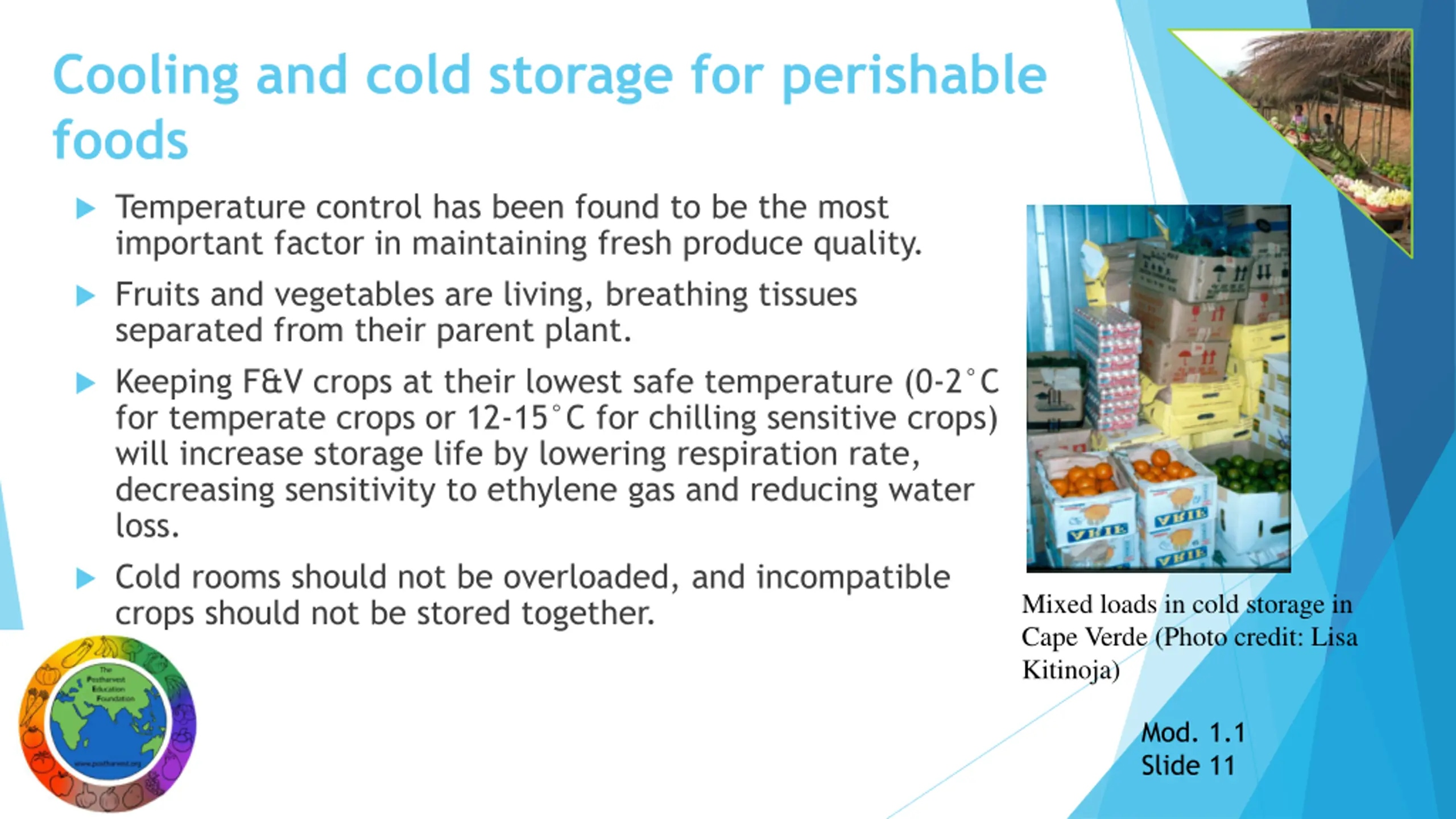 Cooling and cold storage for perishable foods Temperature control has been found to be the most important factor in maintaining fresh produce quality. Fruits and vegetables are living, breathing tissues separated from their parent plant. Keeping F&V crops at their lowest safe temperature (0-2 C for temperate crops or 12-15 C for chilling sensitive crops) will increase storage life by lowering respiration rate, decreasing sensitivity to ethylene gas and reducing water loss. Cold rooms should not be overloaded, and incompatible crops should not be stored together. Mixed loads in cold storage in Cape Verde (Photo credit: Lisa Kitinoja) Mod. 1.1 Slide 11