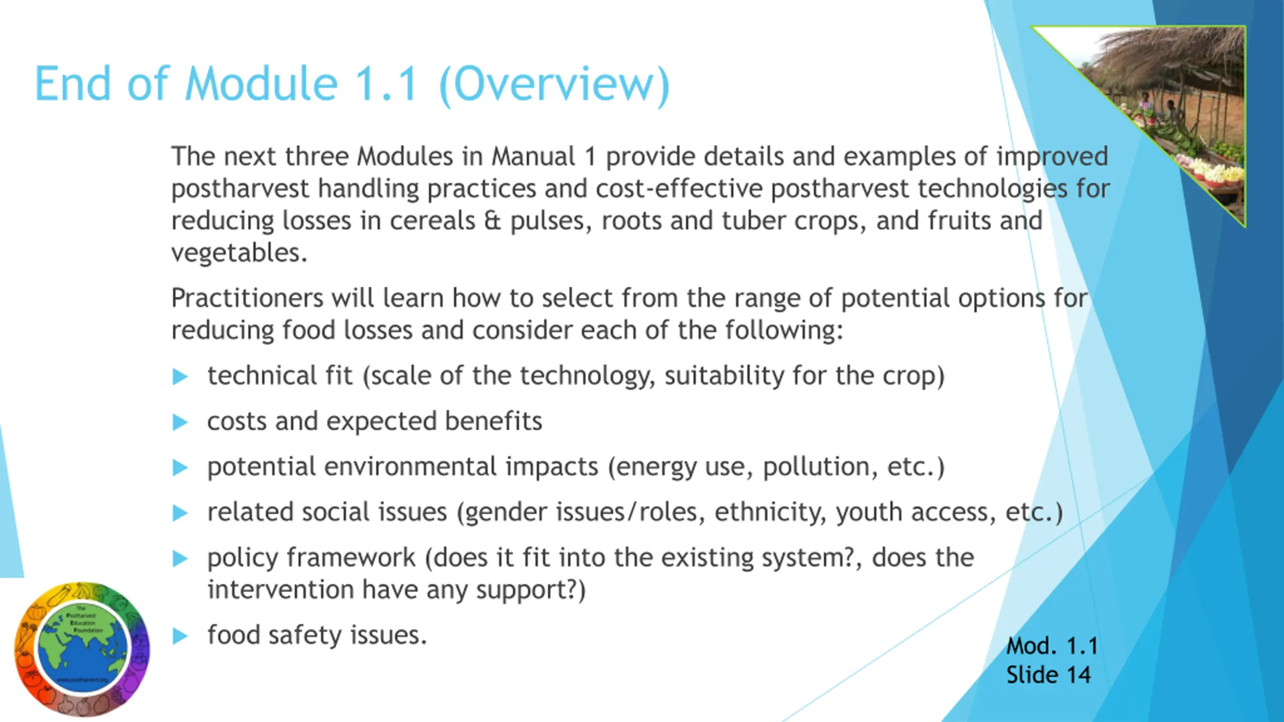 End of Module 1.1 (Overview) The next three Modules in Manual 1 provide details and examples of improved postharvest handling practices and cost-effective postharvest technologies for reducing losses in cereals & pulses, roots and tuber crops, and fruits and vegetables. Practitioners will learn how to select from the range of potential options for reducing food losses and consider each of the following: technical fit (scale of the technology, suitability for the crop) costs and expected benefits potential environmental impacts (energy use, pollution, etc.) related social issues (gender issues/roles, ethnicity, youth access, etc.) policy framework (does it fit into the existing system?, does the intervention have any support?) food safety issues. Mod. 1.1 Slide 14
