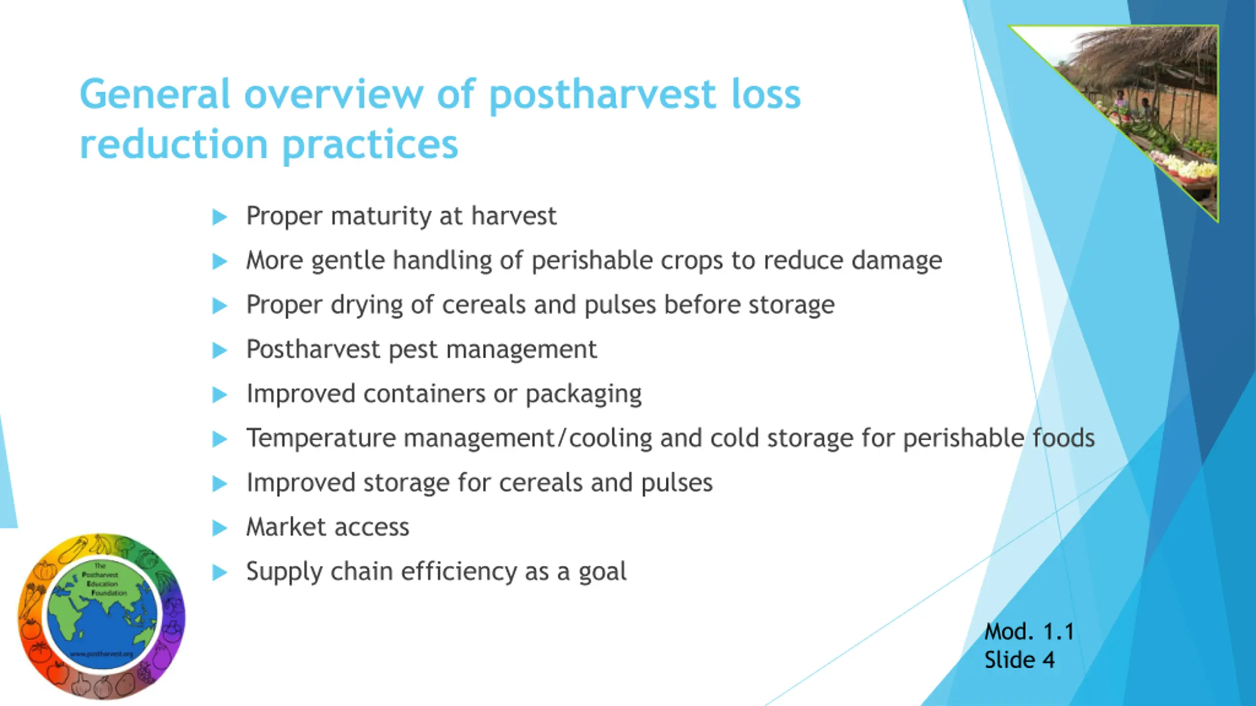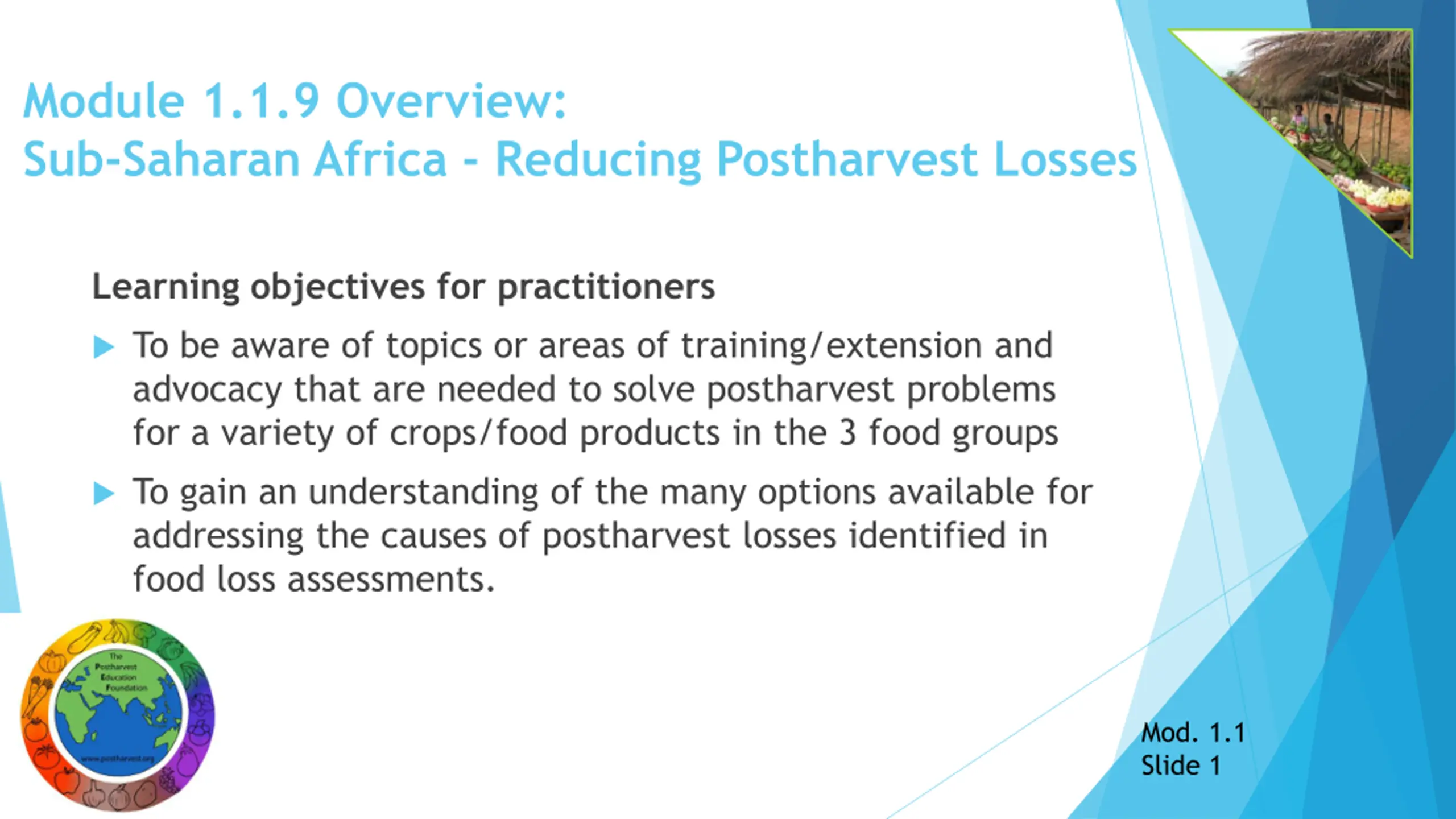 Module 1.1.9Overview: Sub-Saharan Africa - Reducing Postharvest Losses Learning objectives for practitioners To be aware of topics or areas of training/extension and advocacy that are needed to solve postharvest problems for a variety of crops/food products in the 3 food groups To gain an understanding of the many options available for addressing the causes of postharvest losses identified in food loss assessments. Mod. 1.1 Slide 1