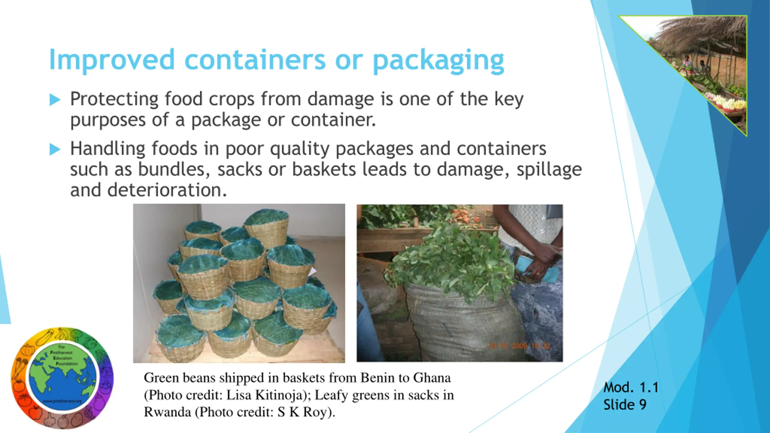 Improved containers or packaging Protecting food crops from damage is one of the key purposes of a package or container. Handling foods in poor quality packages and containers such as bundles, sacks or baskets leads to damage, spillage and deterioration. Green beans shipped in baskets from Benin to Ghana (Photo credit: Lisa Kitinoja); Leafy greens in sacks in Rwanda (Photo credit: S K Roy). Mod. 1.1 Slide 9