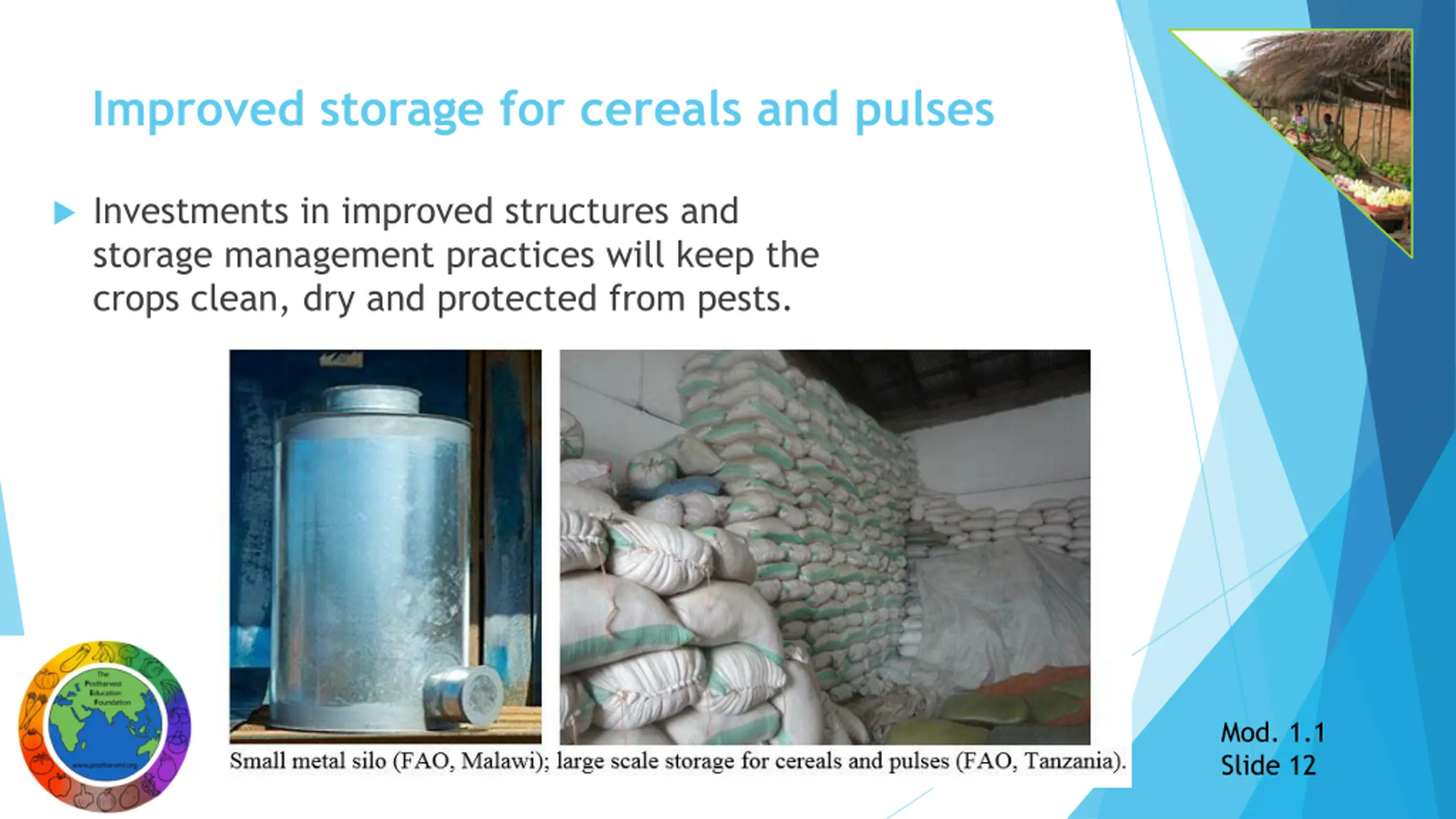 Improved storage for cereals and pulses Investments in improved structures and storage management practices will keep the crops clean, dry and protected from pests. Mod. 1.1 Slide 12