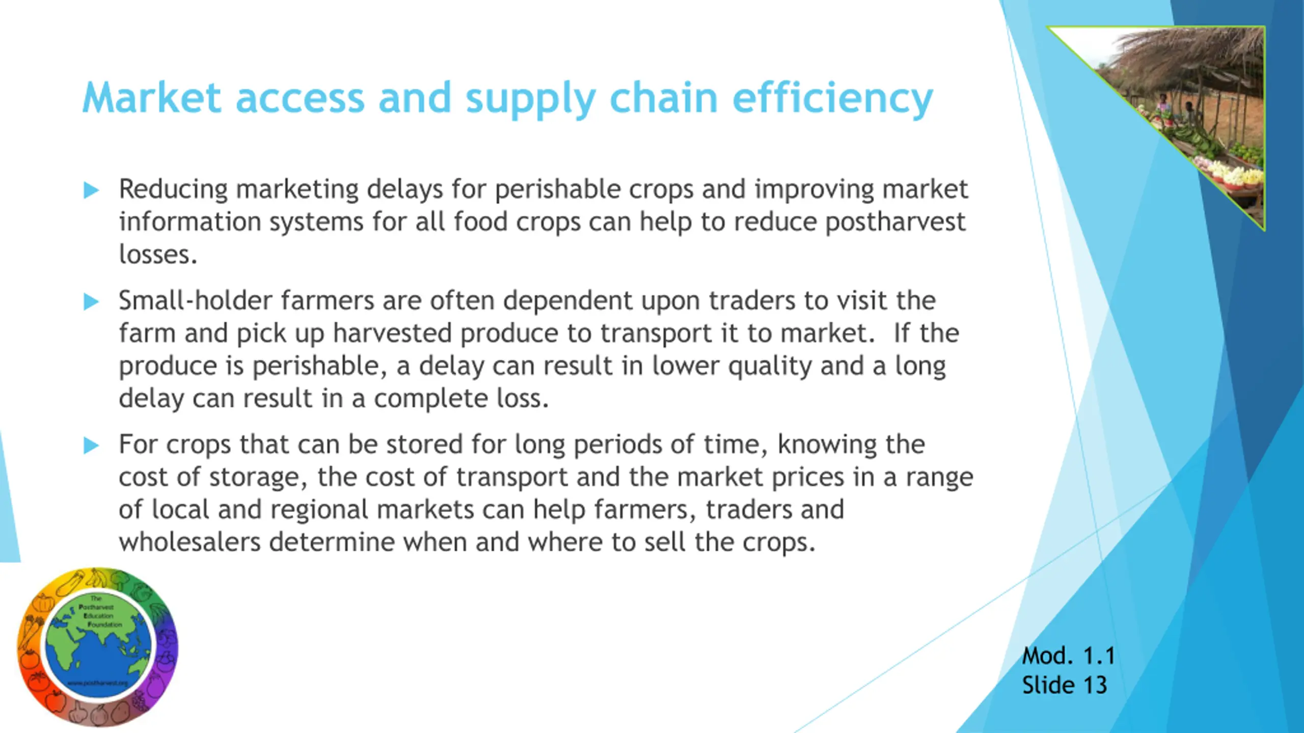 Market access and supply chain efficiency Reducing marketing delays for perishable crops and improving market information systems for all food crops can help to reduce postharvest losses. Small-holder farmers are often dependent upon traders to visit the farm and pick up harvested produce to transport it to market. If the produce is perishable, a delay can result in lower quality and a long delay can result in a complete loss. For crops that can be stored for long periods of time, knowing the cost of storage, the cost of transport and the market prices in a range of local and regional markets can help farmers, traders and wholesalers determine when and where to sell the crops. Mod. 1.1 Slide 13