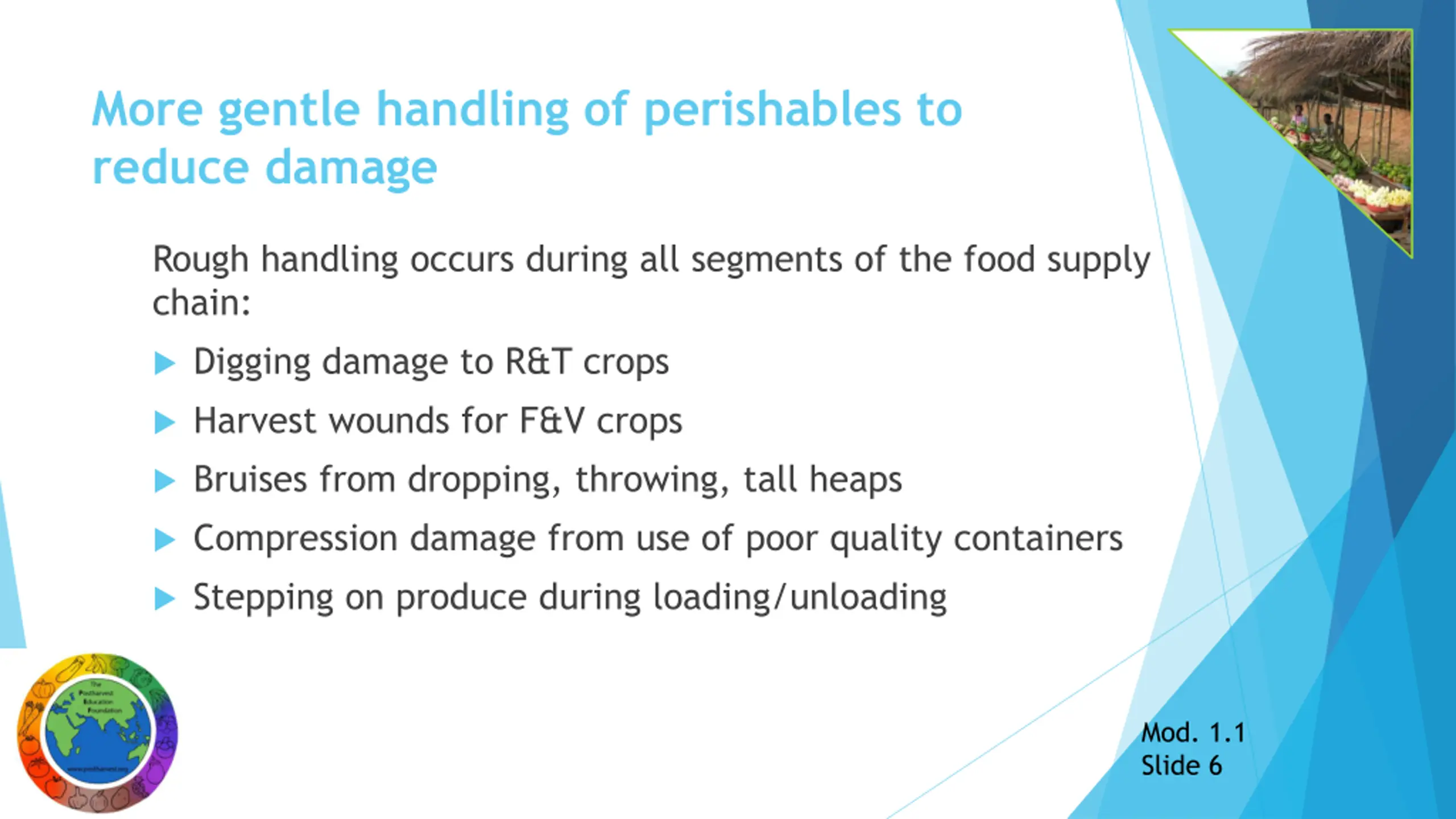 More gentle handling of perishables to reduce damage Rough handling occurs during all segments of the food supply chain: Digging damage to R&T crops Harvest wounds for F&V crops Bruises from dropping, throwing, tall heaps Compression damage from use of poor quality containers Stepping on produce during loading/unloading Mod. 1.1 Slide 6