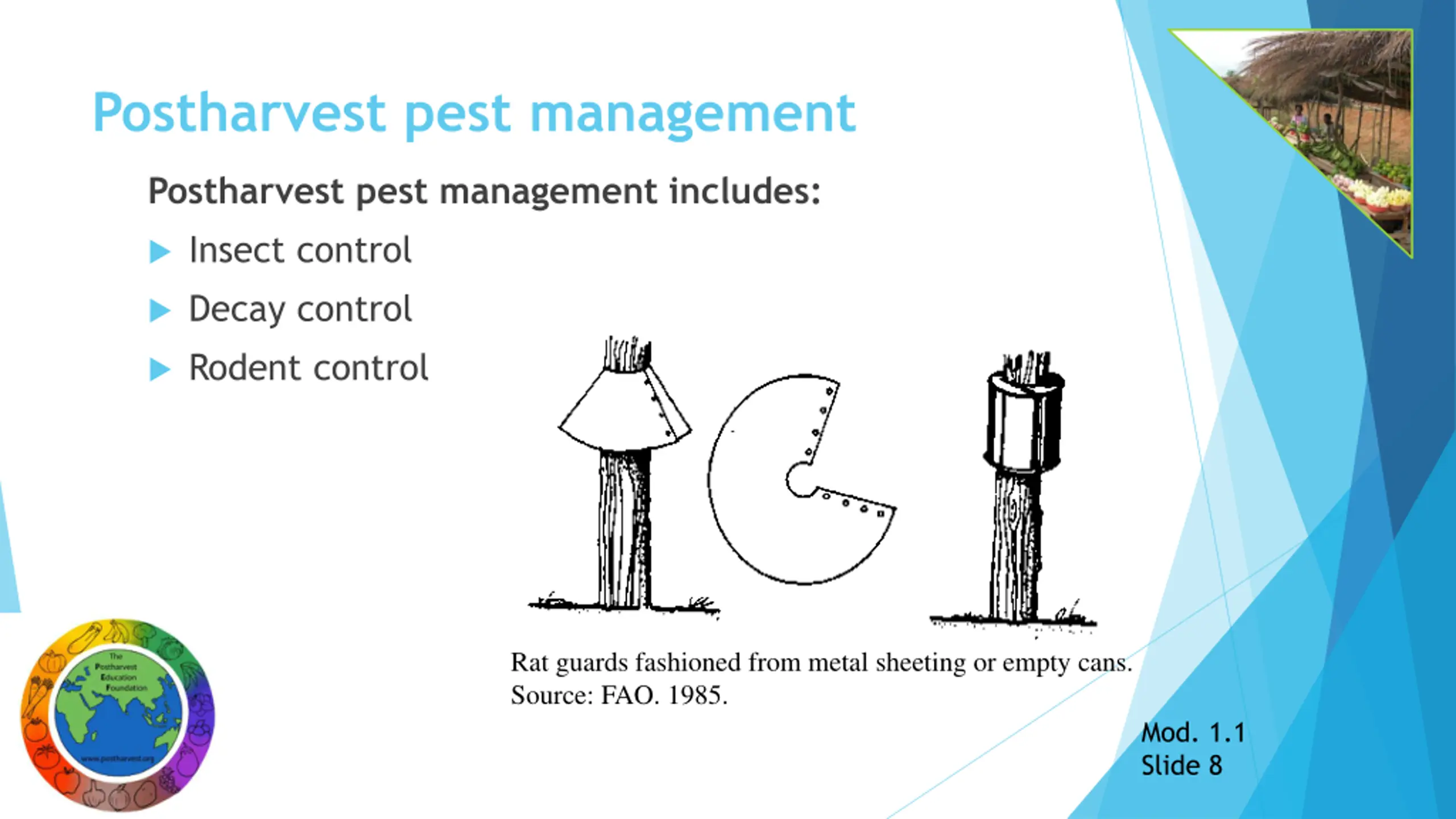 Postharvest pest management Postharvest pest management includes: Insect control Decay control Rodent control Rat guards fashioned from metal sheeting or empty cans. Source: FAO. 1985. Mod. 1.1 Slide 8