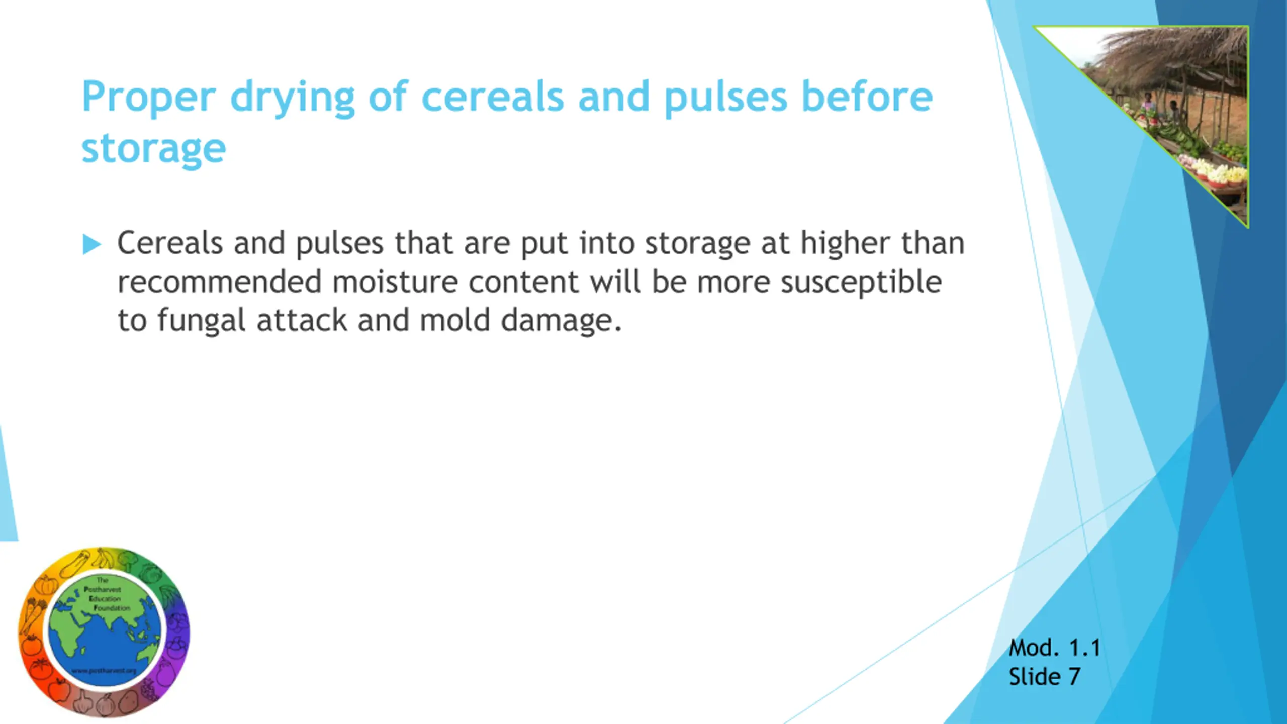 Proper drying of cereals and pulses before storage Cereals and pulses that are put into storage at higher than recommended moisture content will be more susceptible to fungal attack and mold damage. Mod. 1.1 Slide 7