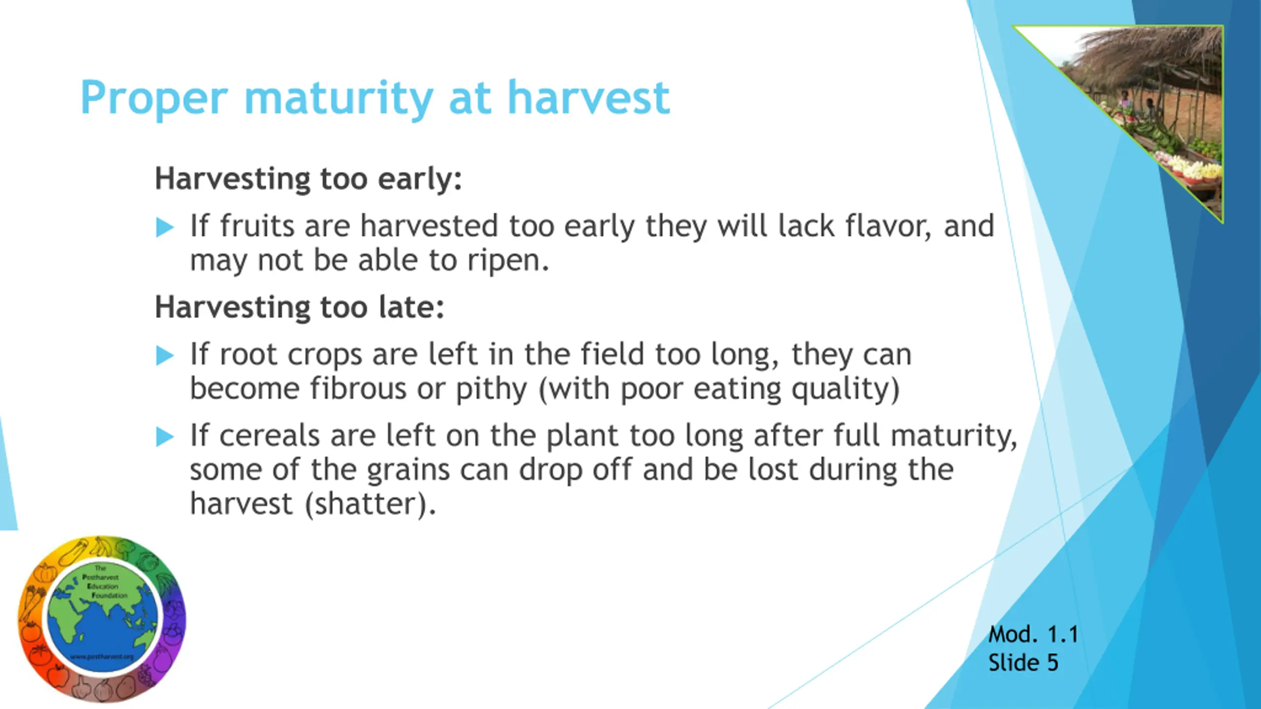Proper maturity at harvest Harvesting too early: If fruits are harvested too early they will lack flavor, and may not be able to ripen. Harvesting too late: If root crops are left in the field too long, they can become fibrous or pithy (with poor eating quality) If cereals are left on the plant too long after full maturity, some of the grains can drop off and be lost during the harvest (shatter). Mod. 1.1 Slide 5
