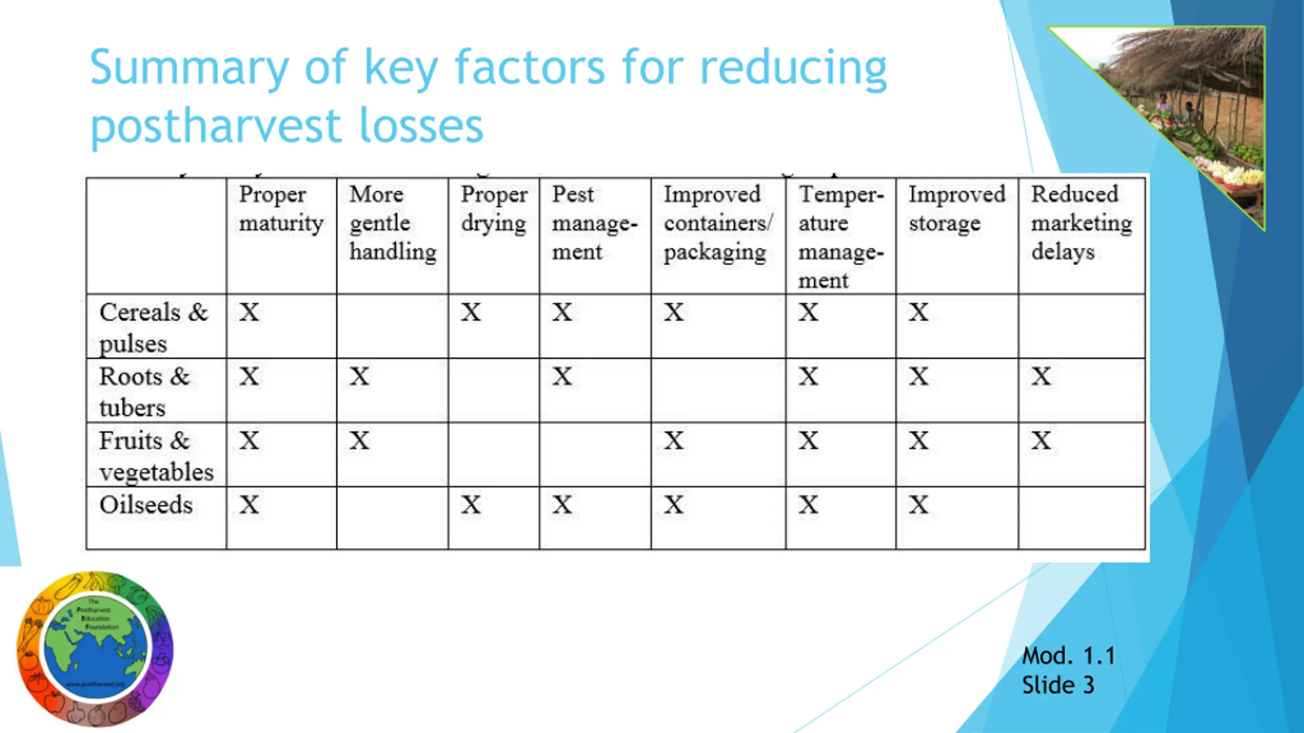 Summary of key factors for reducing postharvest losses Mod. 1.1 Slide 3