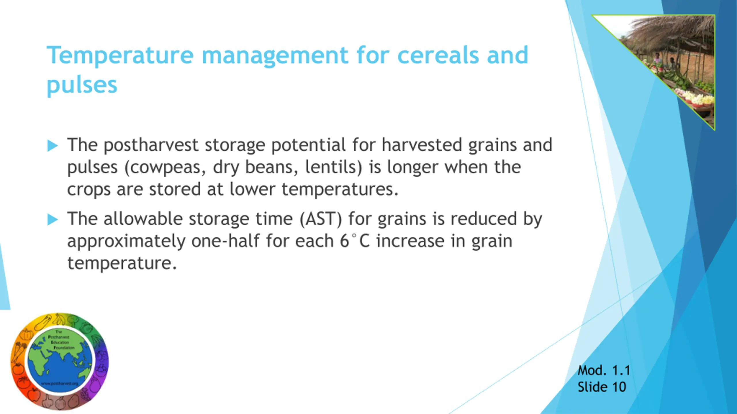 Temperature management for cereals and pulses The postharvest storage potential for harvested grains and pulses (cowpeas, dry beans, lentils) is longer when the crops are stored at lower temperatures. The allowable storage time (AST) for grains is reduced by approximately one-half for each 6 C increase in grain temperature. Mod. 1.1 Slide 10