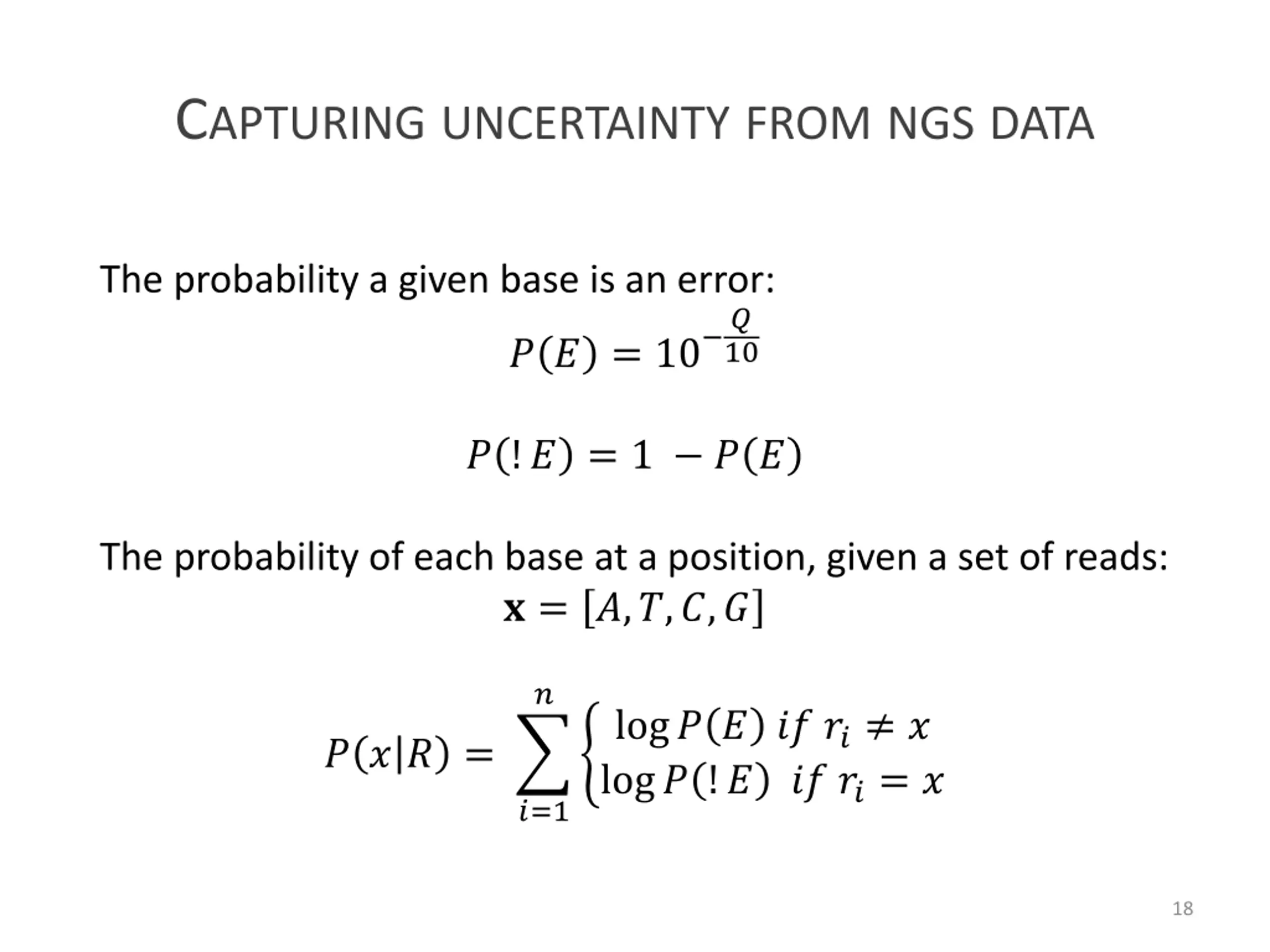 CAPTURINGUNCERTAINTYFROMNGSDATA The probability a given base is an error: ? ? = 10 ? 10 ? !? = 1 ? ? 17