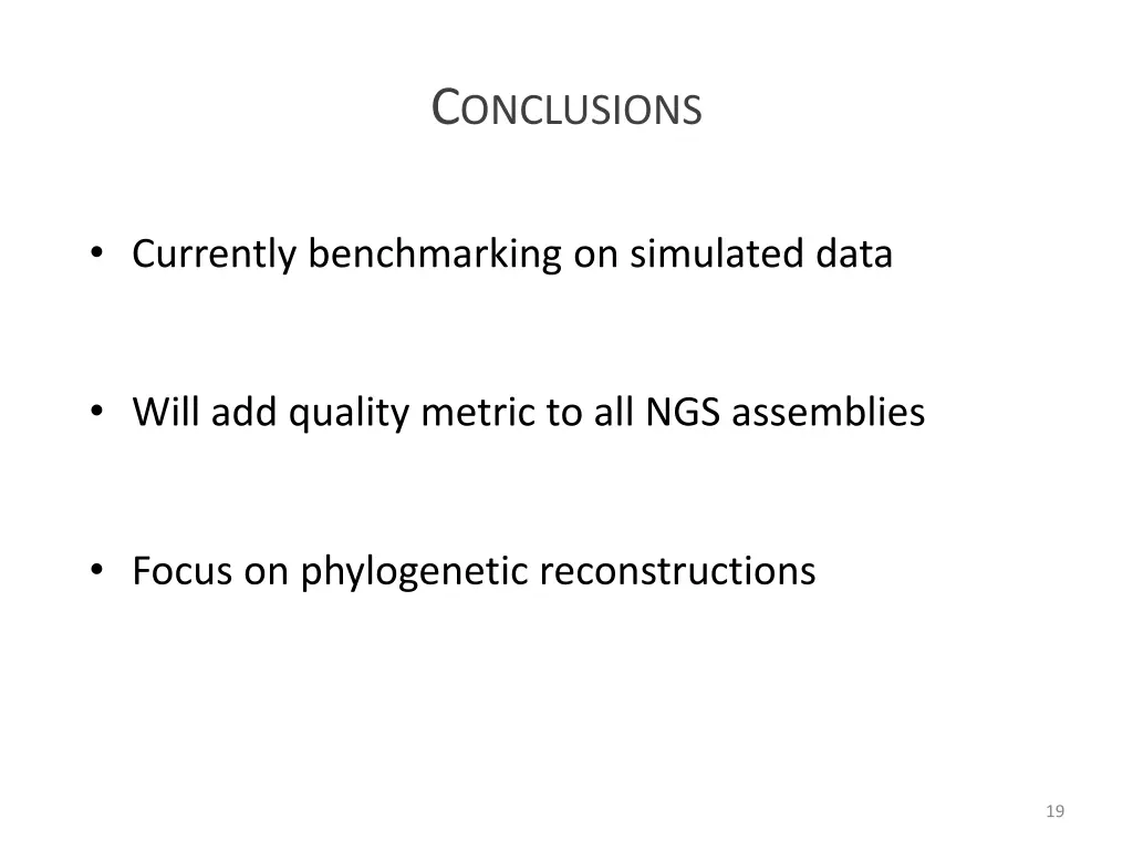 CONCLUSIONS Currently benchmarking on simulated data Will add quality metric to all NGS assemblies Focus on phylogenetic reconstructions 19