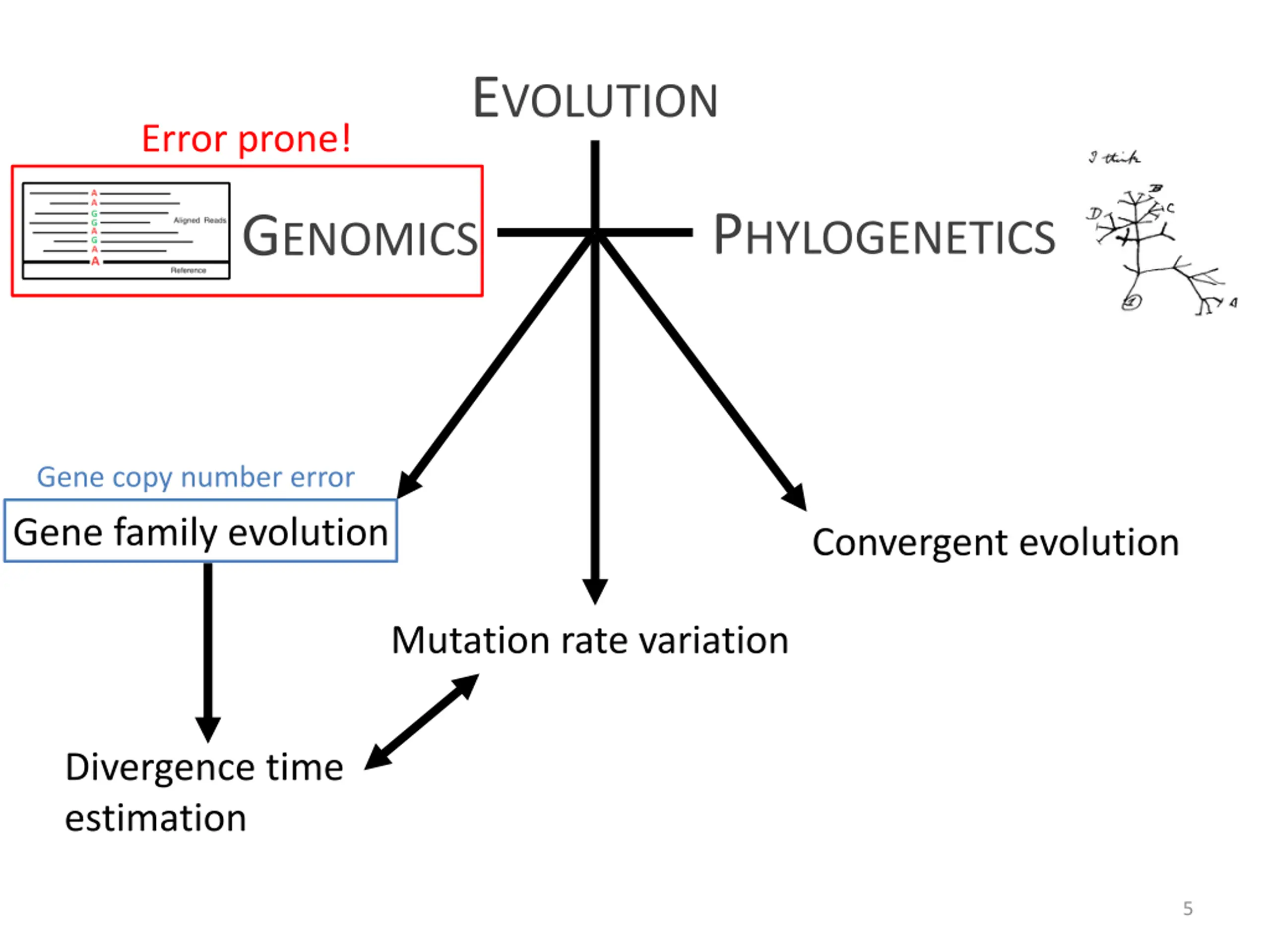 EVOLUTION Error prone! PHYLOGENETICS GENOMICS Gene copy number error Gene family evolution Convergent evolution Mutation rate variation Divergence time estimation 5