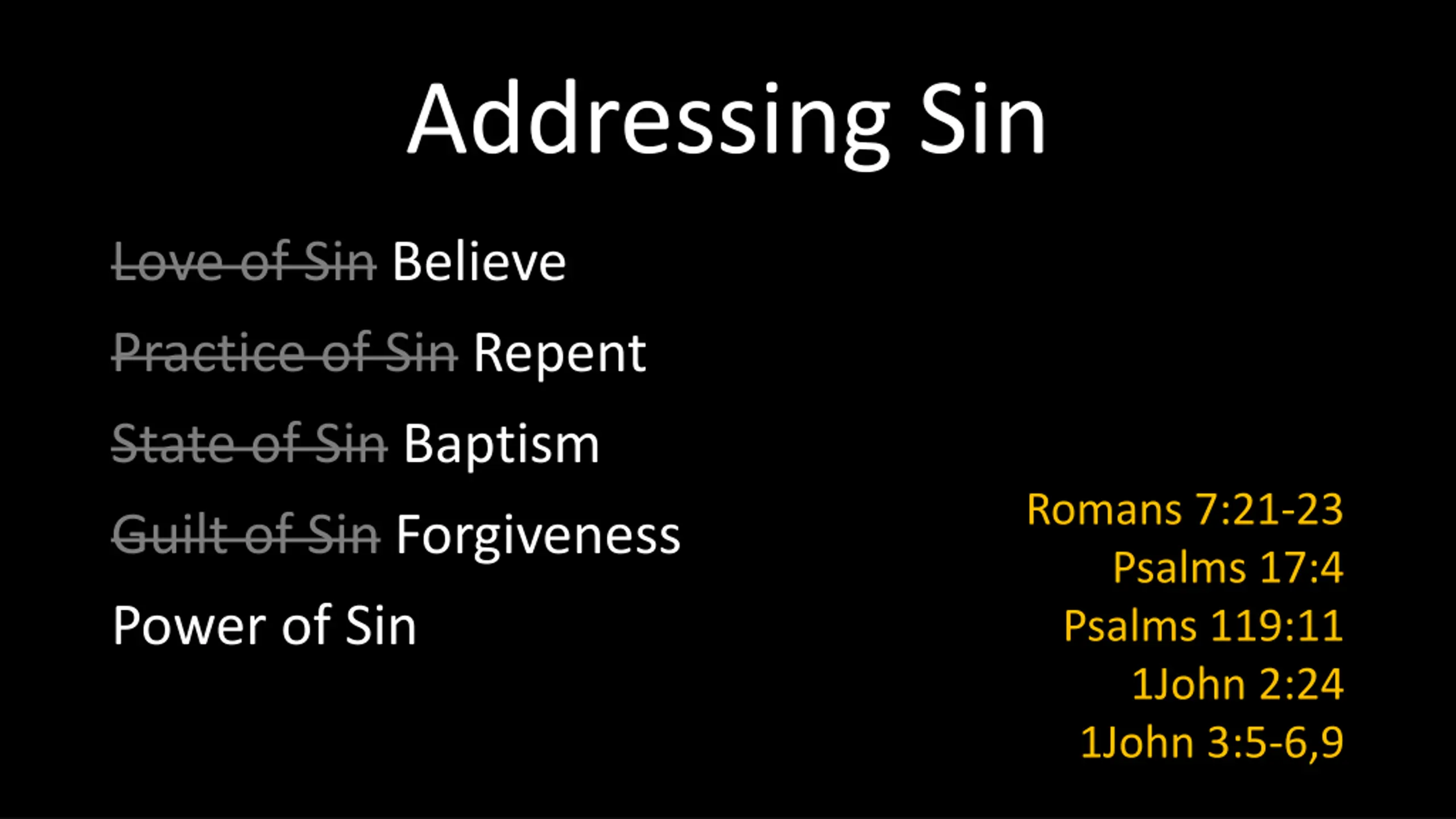 Addressing Sin Love of Sin Believe Practice of Sin Repent State of Sin Baptism Romans 7:21-23 Psalms 17:4 Psalms 119:11 1John 2:24 1John 3:5-6,9 Guilt of Sin Forgiveness Power of Sin