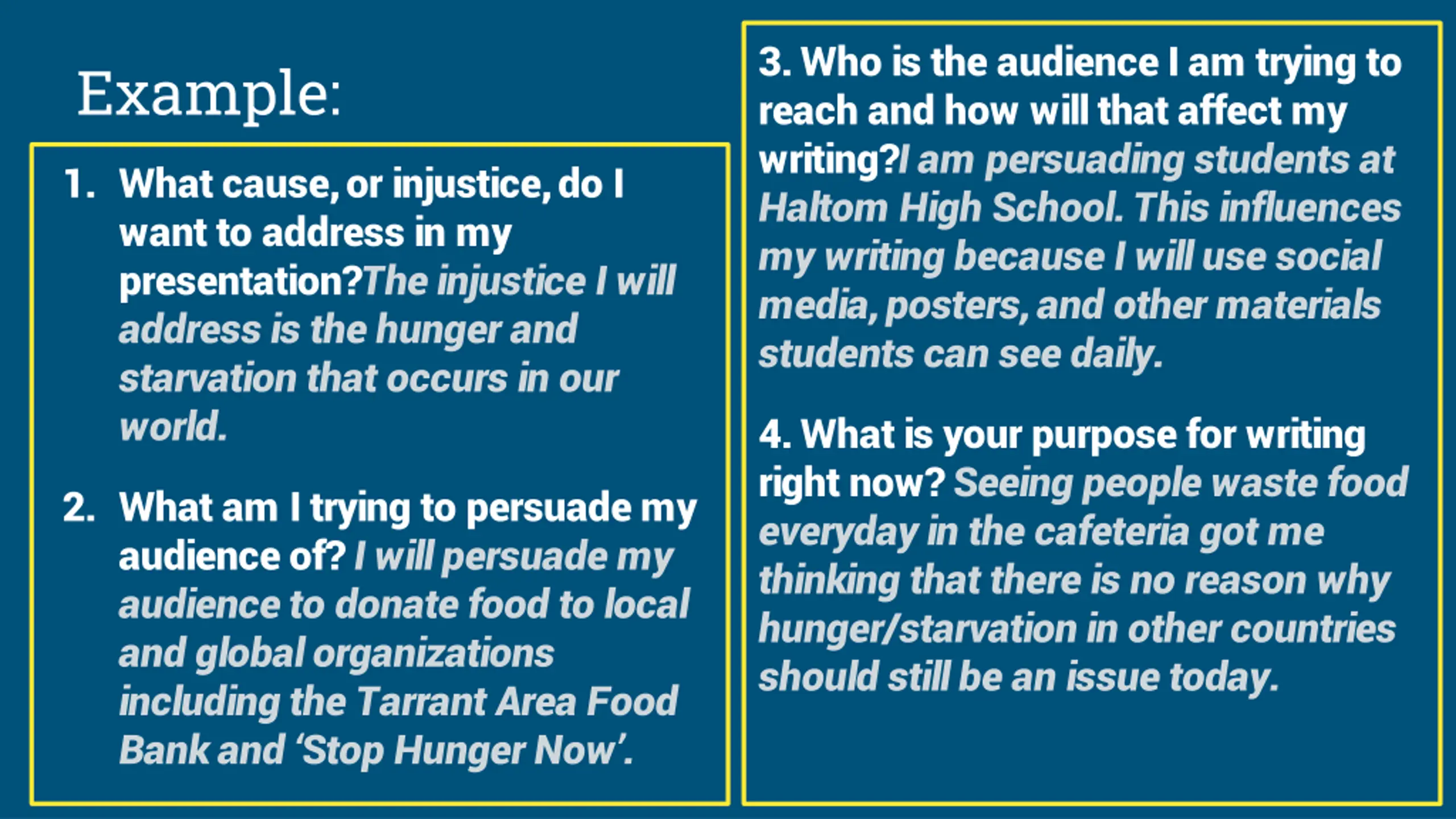3. Who is the audience I am trying to reach and how will that affect my writing?I am persuading students at Haltom High School. This influences my writing because I will use social media, posters, and other materials students can see daily. Example: 1. What cause, or injustice, do I want to address in my presentation?The injustice I will address is the hunger and starvation that occurs in our world. 4. What is your purpose for writing right now? Seeing people waste food everyday in the cafeteria got me thinking that there is no reason why hunger/starvation in other countries should still be an issue today. 2. What am I trying to persuade my audience of? I will persuade my audience to donate food to local and global organizations including the Tarrant Area Food Bank and Stop Hunger Now .
