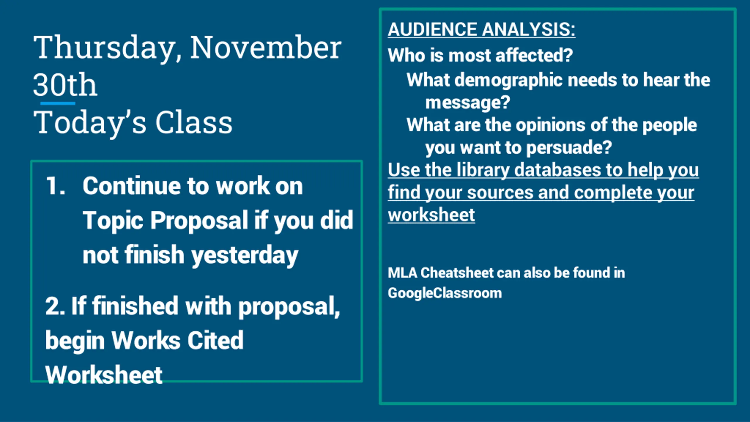 AUDIENCE ANALYSIS: Who is most affected? What demographic needs to hear the message? What are the opinions of the people you want to persuade? Use the library databases to help you find your sources and complete your worksheet Thursday, November 30th Today s Class 1. Continue to work on Topic Proposal if you did not finish yesterday MLA Cheatsheet can also be found in GoogleClassroom 2. If finished with proposal, begin Works Cited Worksheet