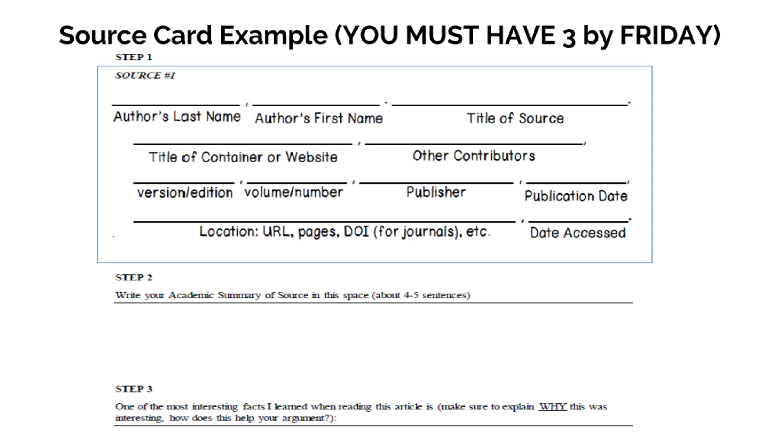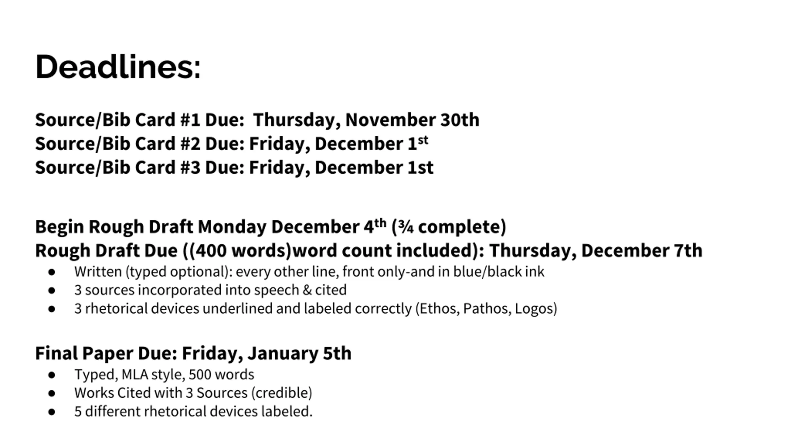 Deadlines: Source/Bib Card #1 Due: Thursday, November 30th Source/Bib Card #2 Due: Friday, December 1st Source/Bib Card #3 Due: Friday, December 1st Begin Rough Draft Monday December 4th( complete) Rough Draft Due ((400 words)word count included): Thursday, December 7th Written (typed optional): every other line, front only-and in blue/black ink 3 sources incorporated into speech & cited 3 rhetorical devices underlined and labeled correctly (Ethos, Pathos, Logos) Final Paper Due: Friday, January 5th Typed, MLA style, 500 words Works Cited with 3 Sources (credible) 5 different rhetorical devices labeled.