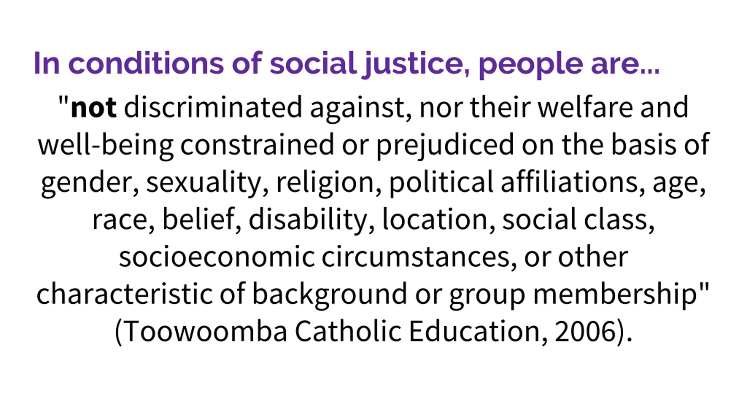 In conditions of social justice, people are... "notdiscriminated against, nor their welfare and well-being constrained or prejudiced on the basis of gender, sexuality, religion, political affiliations, age, race, belief, disability, location, social class, socioeconomic circumstances, or other characteristic of background or group membership" (Toowoomba Catholic Education, 2006).