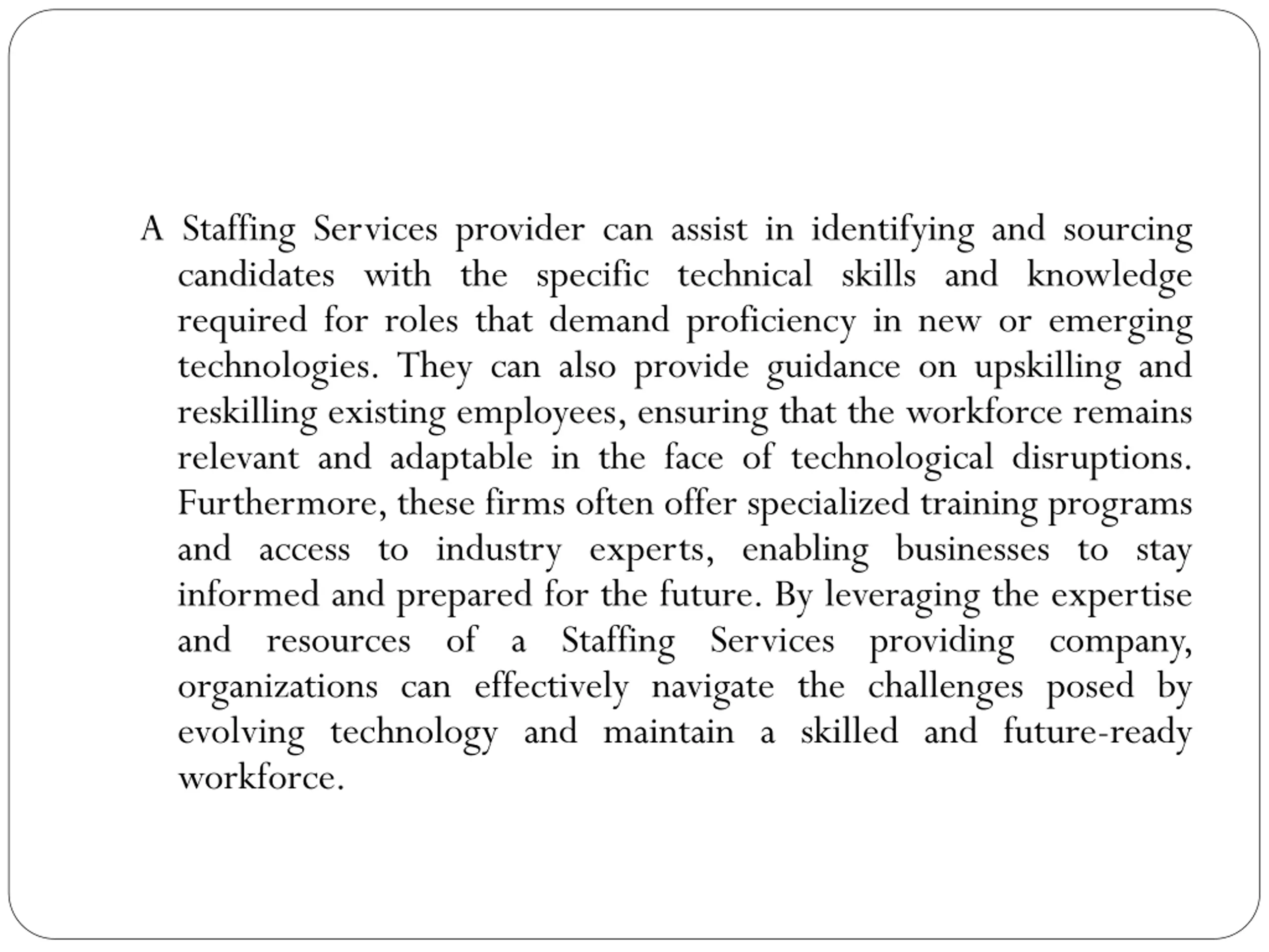 A Staffing Services provider can assist in identifying and sourcing candidates with the specific technical skills and knowledge required for roles that demand proficiency in new or emerging technologies. They can also provide guidance on upskilling and reskilling existing employees, ensuring that the workforce remains relevant and adaptable in the face of technological disruptions. Furthermore,these firms often offer specialized training programs and access to industry experts, enabling businesses to stay informed and prepared for the future. By leveraging the expertise and resources of a Staffing Services providing company, organizations can effectively navigate the challenges posed by evolving technology and maintain a skilled and future-ready workforce.