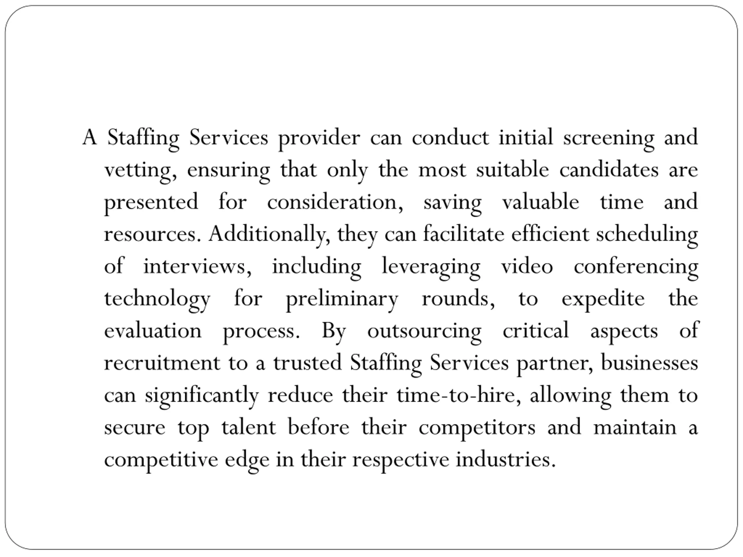 A Staffing Services provider can conduct initial screening and vetting, ensuring that only the most suitable candidates are presented for consideration, saving valuable time and resources.Additionally,they can facilitate efficient scheduling of interviews, including leveraging video conferencing technology for preliminary rounds, to expedite the evaluation process. By outsourcing critical aspects of recruitment to a trusted Staffing Services partner, businesses can significantly reduce their time-to-hire, allowing them to secure top talent before their competitors and maintain a competitive edge in their respective industries.