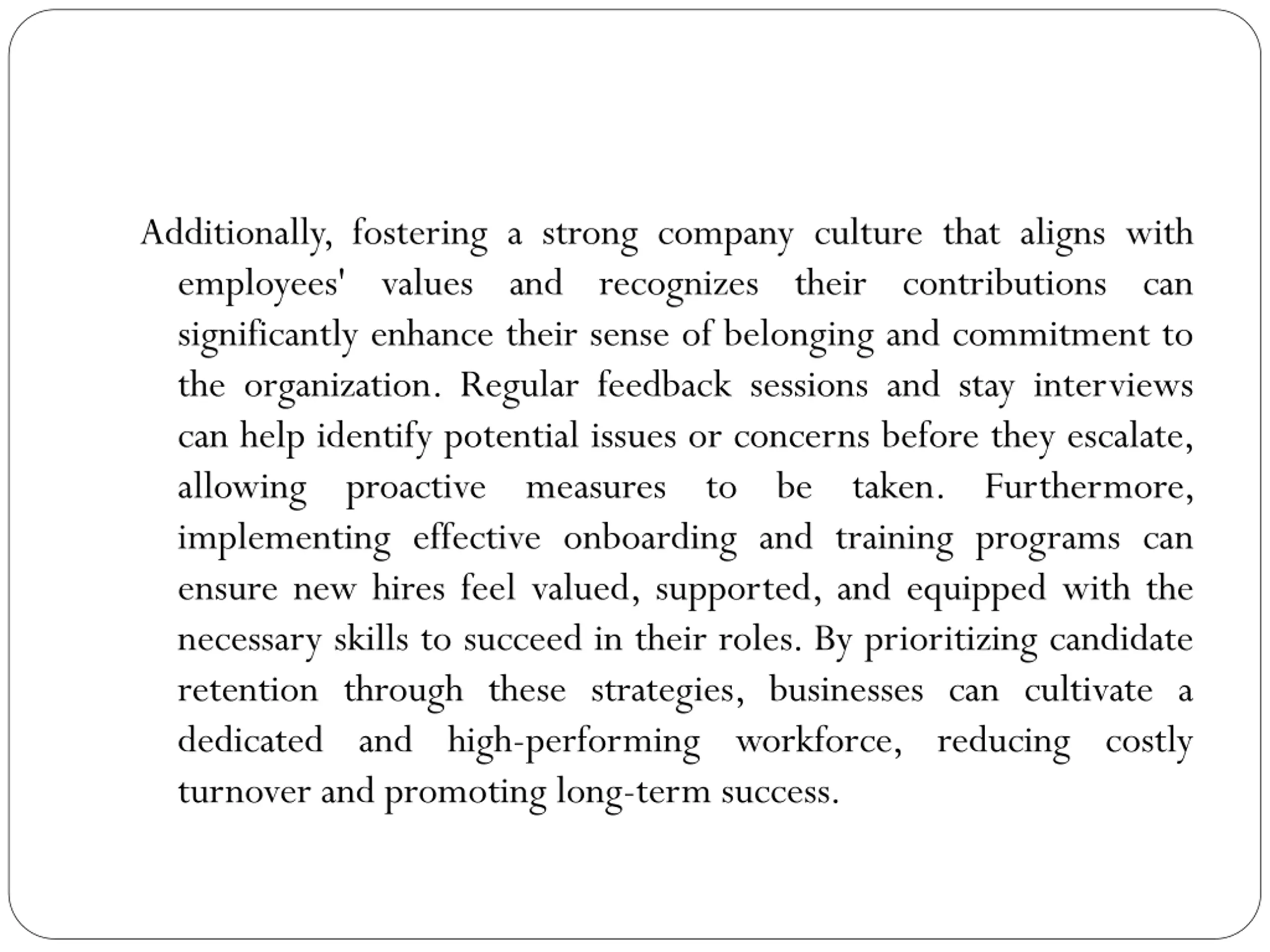 Additionally, fostering a strong company culture that aligns with employees' values and recognizes their contributions can significantly enhance their sense of belonging and commitment to the organization. Regular feedback sessions and stay interviews can help identify potential issues or concerns before they escalate, allowing proactive measures implementing effective onboarding and training programs can ensure new hires feel valued, supported, and equipped with the necessary skills to succeed in their roles. By prioritizing candidate retention through these strategies, businesses can cultivate a dedicated and high-performing workforce, reducing costly turnover and promoting long-term success. to be taken. Furthermore,