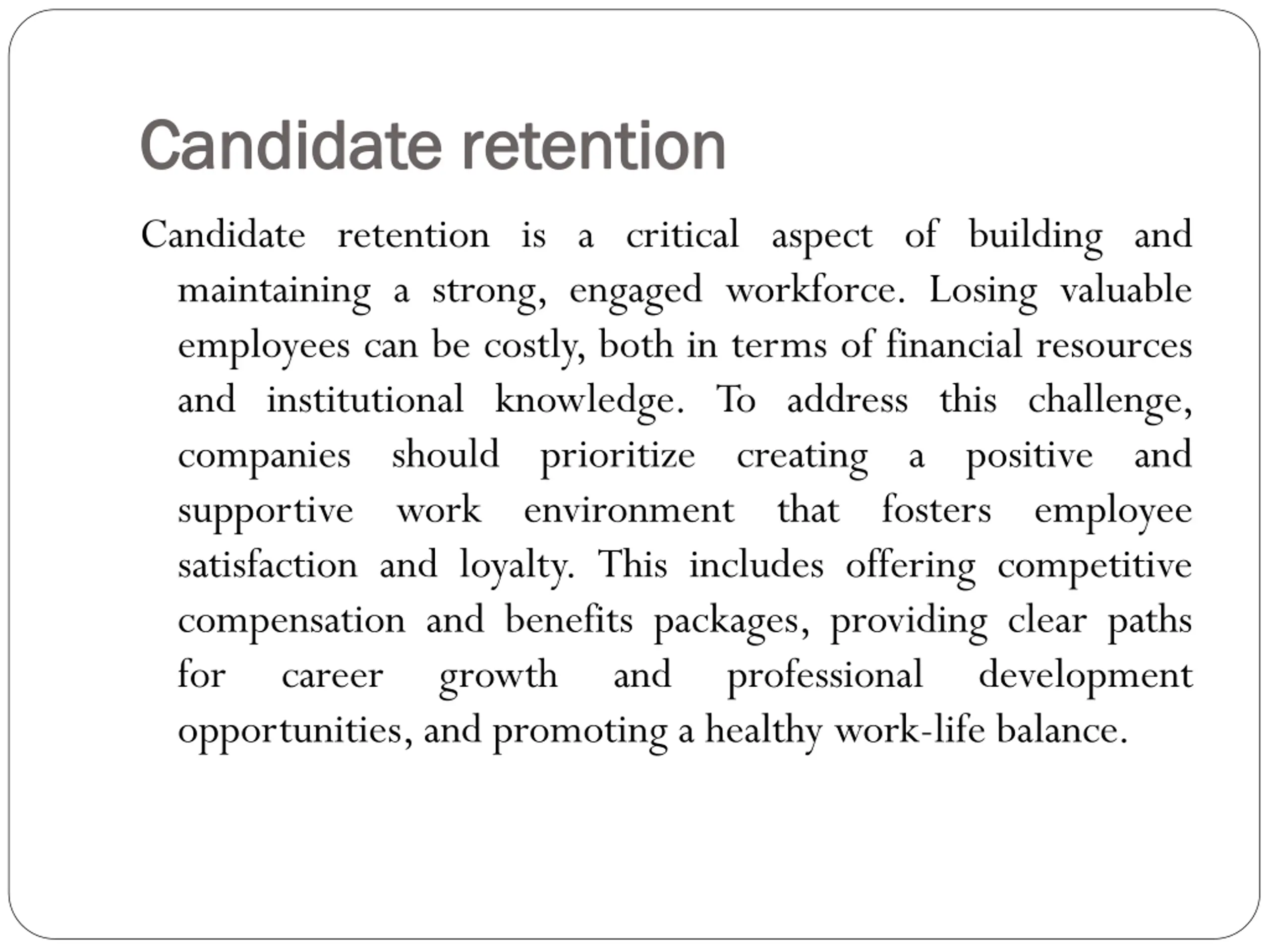 Candidate retention Candidate retention Candidate retention is a critical aspect of building and maintaining a strong, engaged workforce. Losing valuable employees can be costly, both in terms of financial resources and institutional knowledge. To address this challenge, companies should prioritize creating a positive and supportive work environment satisfaction and loyalty. This includes offering competitive compensation and benefits packages, providing clear paths for career growth and opportunities,and promoting a healthy work-life balance. that fosters employee professional development