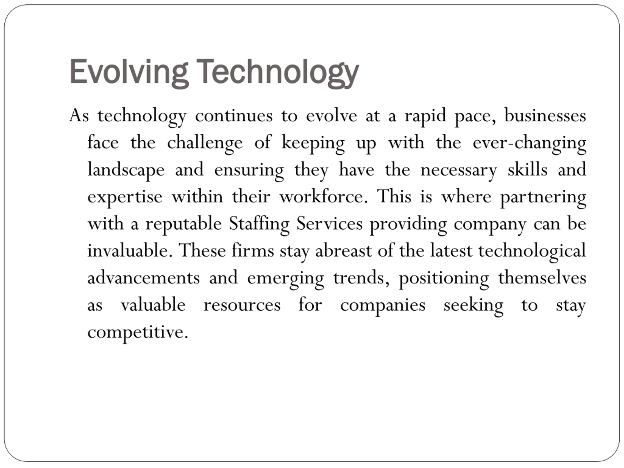 Evolving Technology Evolving Technology As technology continues to evolve at a rapid pace, businesses face the challenge of keeping up with the ever-changing landscape and ensuring they have the necessary skills and expertise within their workforce. This is where partnering with a reputable Staffing Services providing company can be invaluable.These firms stay abreast of the latest technological advancements and emerging trends, positioning themselves as valuable resources for companies seeking to stay competitive.