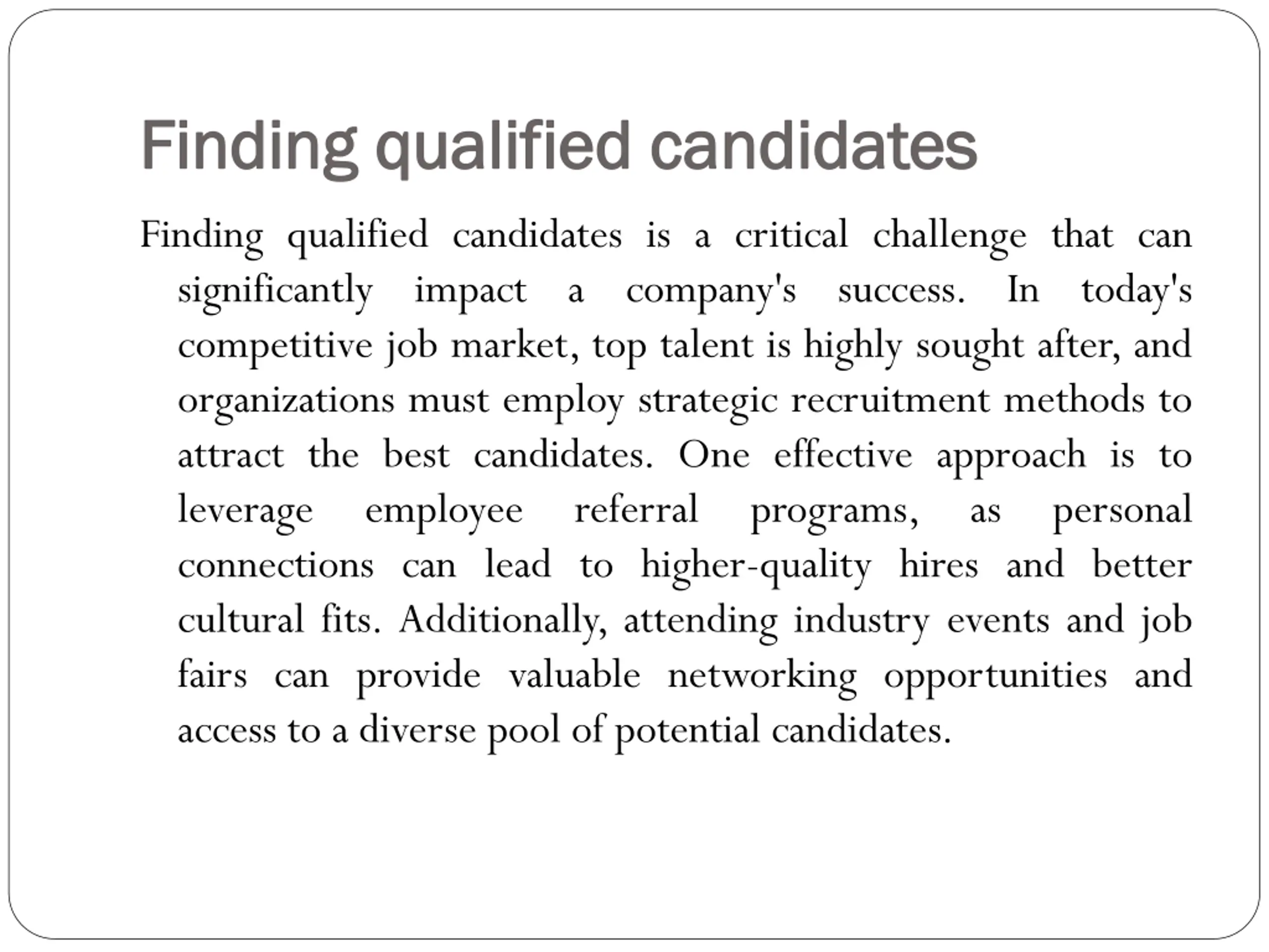 Finding qualified candidates Finding qualified candidates Finding qualified candidates is a critical challenge that can significantly impact a company's success. In today's competitive job market, top talent is highly sought after, and organizations must employ strategic recruitment methods to attract the best candidates. One effective approach is to leverage employee referral connections can lead to higher-quality hires and better cultural fits. Additionally, attending industry events and job fairs can provide valuable networking opportunities and access to a diverse pool of potential candidates. programs, as personal