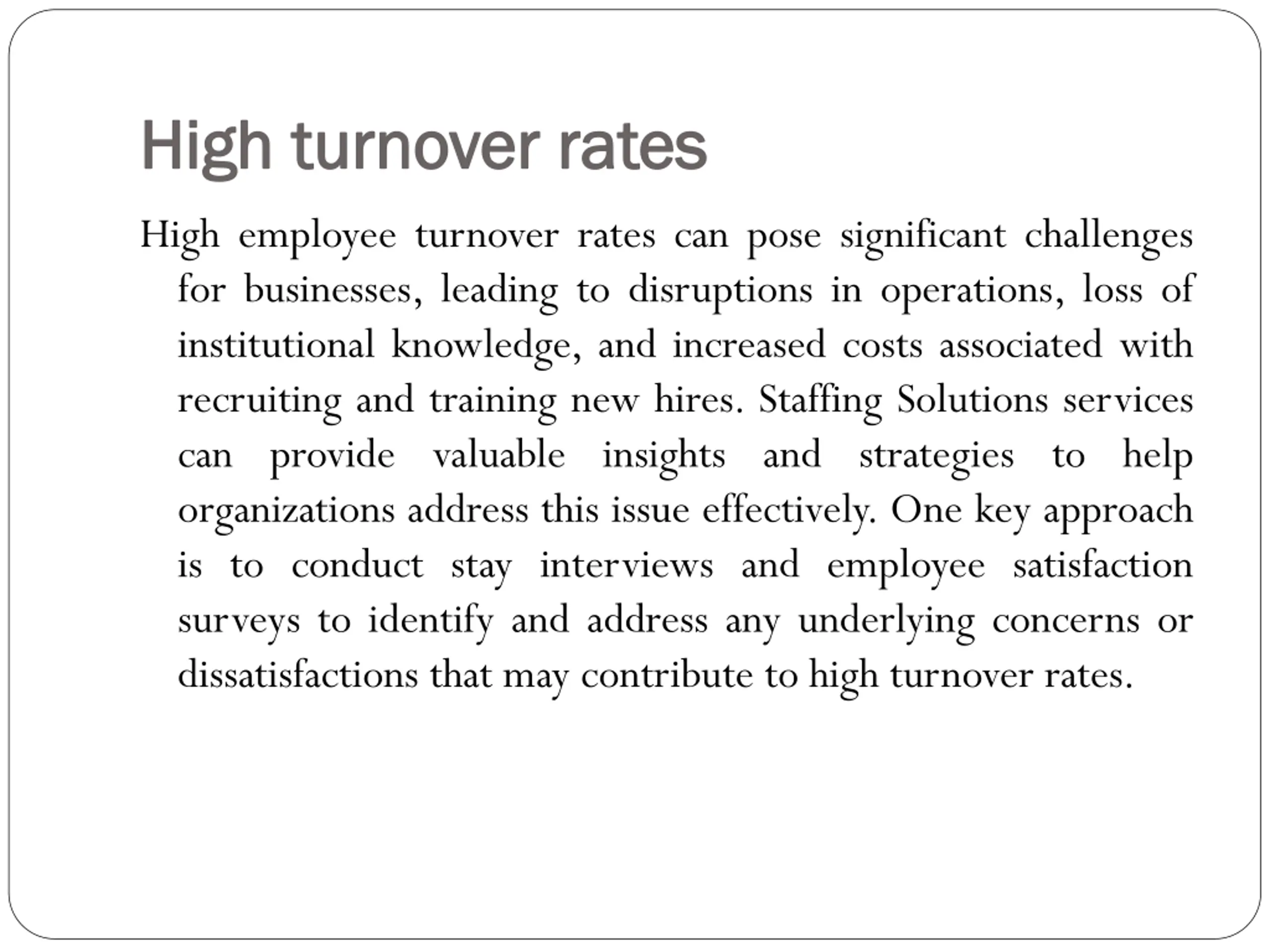High turnover rates High turnover rates High employee turnover rates can pose significant challenges for businesses, leading to disruptions in operations, loss of institutional knowledge, and increased costs associated with recruiting and training new hires. Staffing Solutions services can provide valuable insights and strategies to help organizations address this issue effectively. One key approach is to conduct stay interviews and employee satisfaction surveys to identify and address any underlying concerns or dissatisfactions that may contribute to high turnover rates.