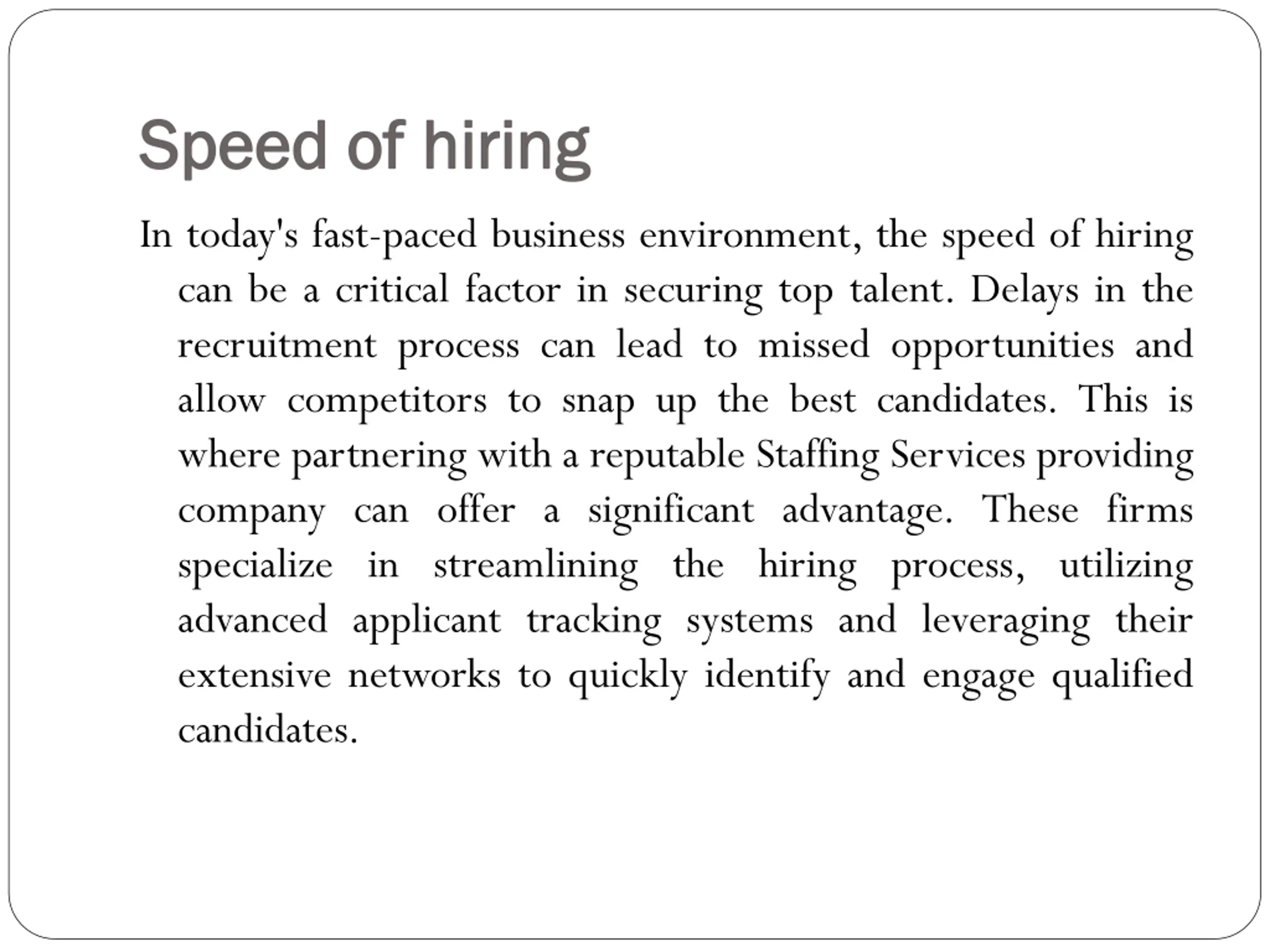 Speed of hiring Speed of hiring In today's fast-paced business environment, the speed of hiring can be a critical factor in securing top talent. Delays in the recruitment process can lead to missed opportunities and allow competitors to snap up the best candidates. This is where partnering with a reputable Staffing Services providing company can offer a significant advantage. These firms specialize in streamlining the hiring process, utilizing advanced applicant tracking systems and leveraging their extensive networks to quickly identify and engage qualified candidates.
