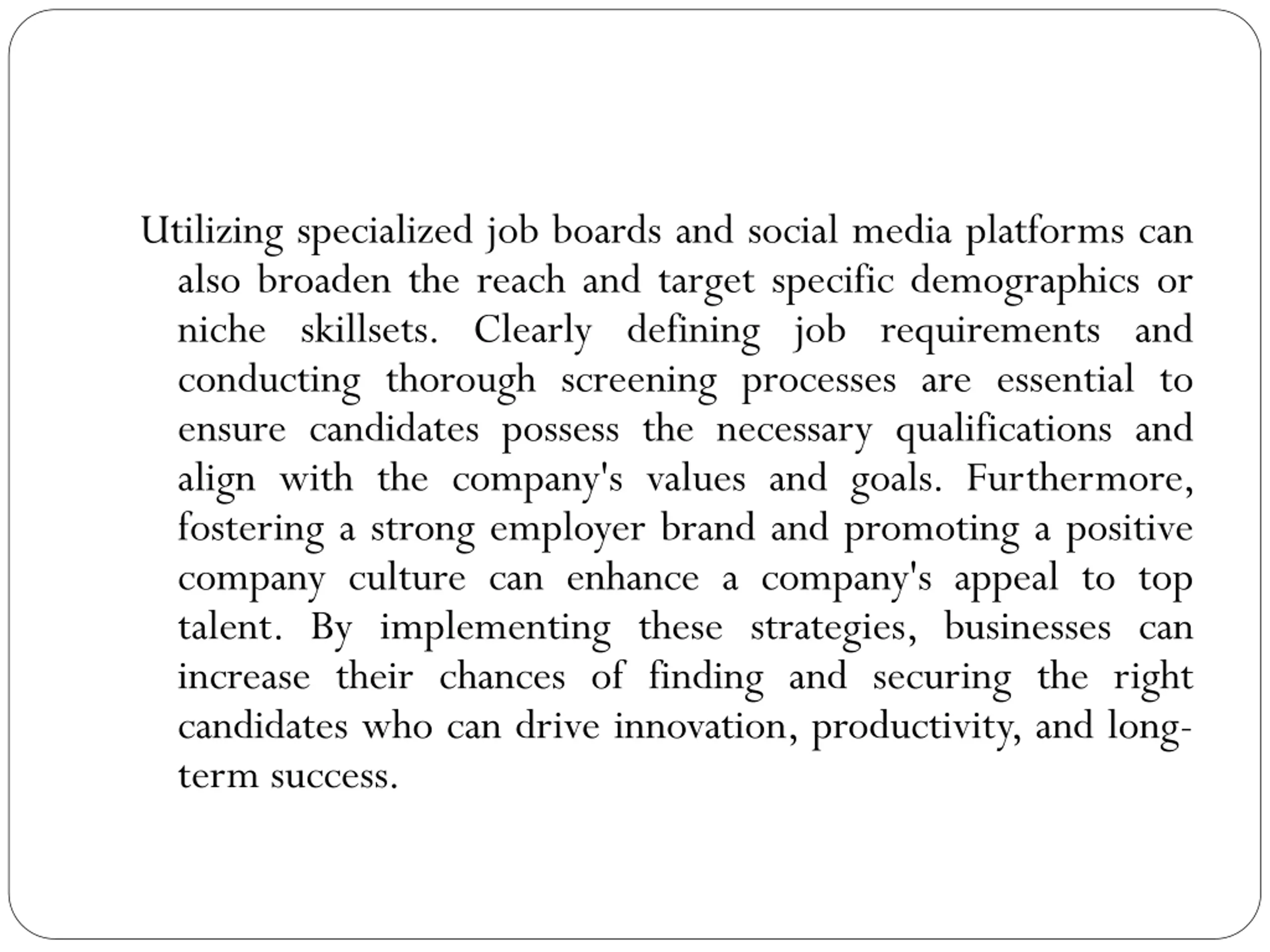 Utilizing specialized job boards and social media platforms can also broaden the reach and target specific demographics or niche skillsets. Clearly defining job requirements and conducting thorough screening processes are essential to ensure candidates possess the necessary qualifications and align with the company's values and goals. Furthermore, fostering a strong employer brand and promoting a positive company culture can enhance a company's appeal to top talent. By implementing these strategies, businesses can increase their chances of finding and securing the right candidates who can drive innovation, productivity, and long- term success.