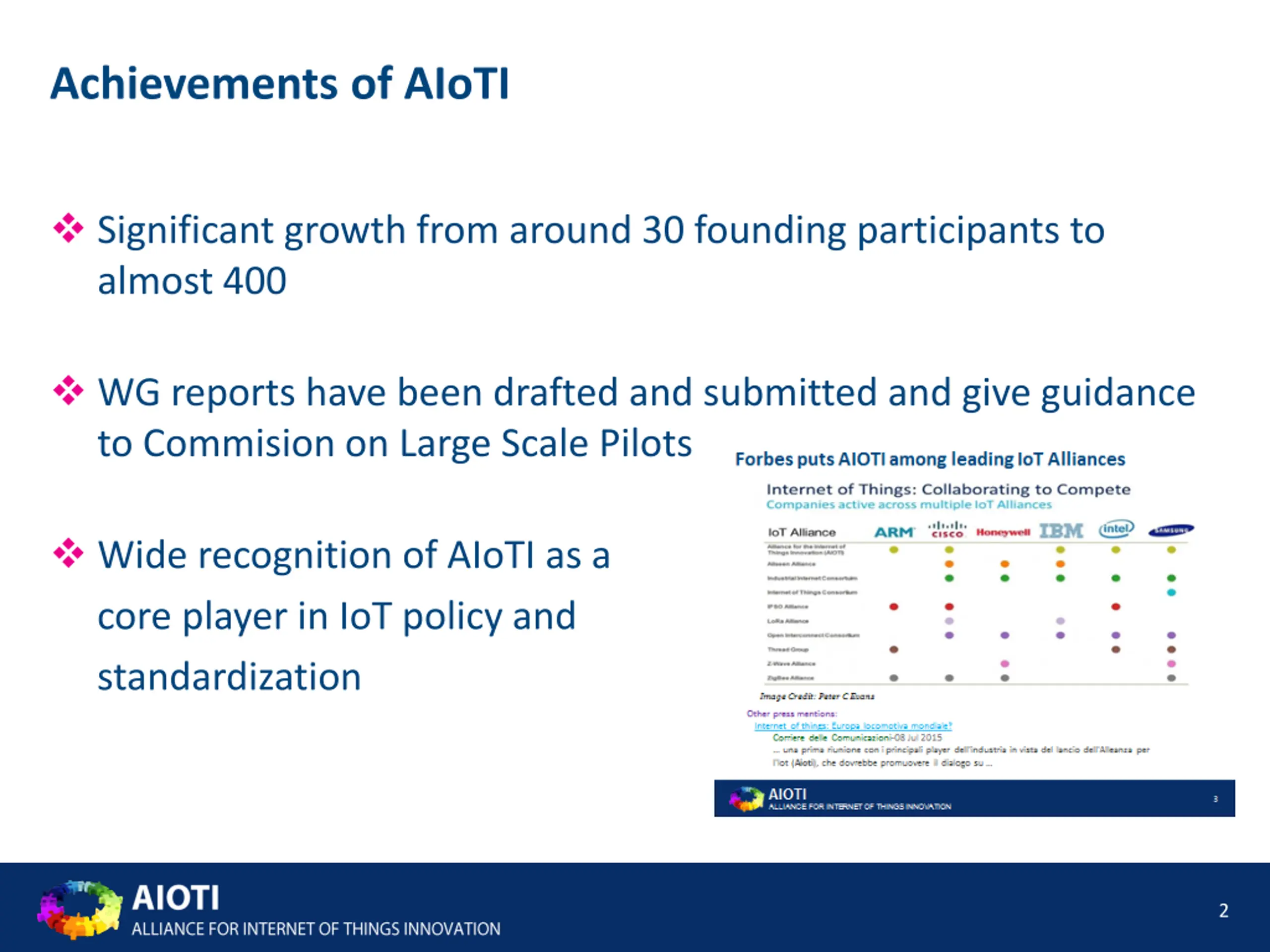 Achievements of AIoTI Significant growth from around 30 founding participants to almost 400 WG reports have been drafted and submitted and give guidance to Commision on Large Scale Pilots Wide recognition of AIoTI as a core player in IoT policy and standardization 2