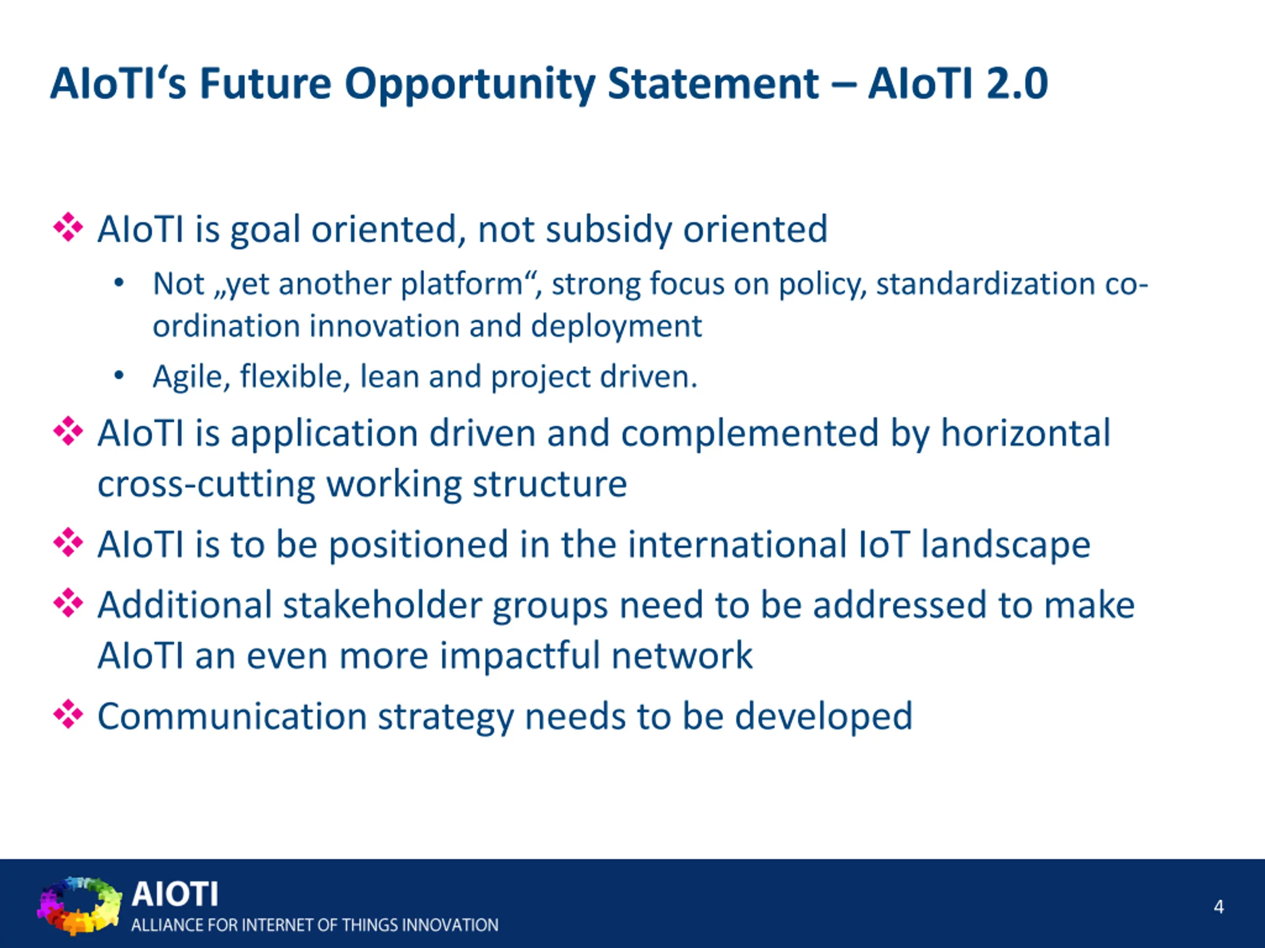 AIoTI is at a cross-road Phase ONE is concluded significant input into DG CNCT on preparation of LSPs has been delivered AIoTI has delivered based on a strong, dedicated and forward looking mindset of its members. AIoTI is characterized by a culture of pro-active engagement and constructive dialogue resulting in thought-leadership Based on this spirit, phase TWO is to be defined: confirmation of vision and mission future deliverables legal format, organizational and financial framework actions to be taken 3
