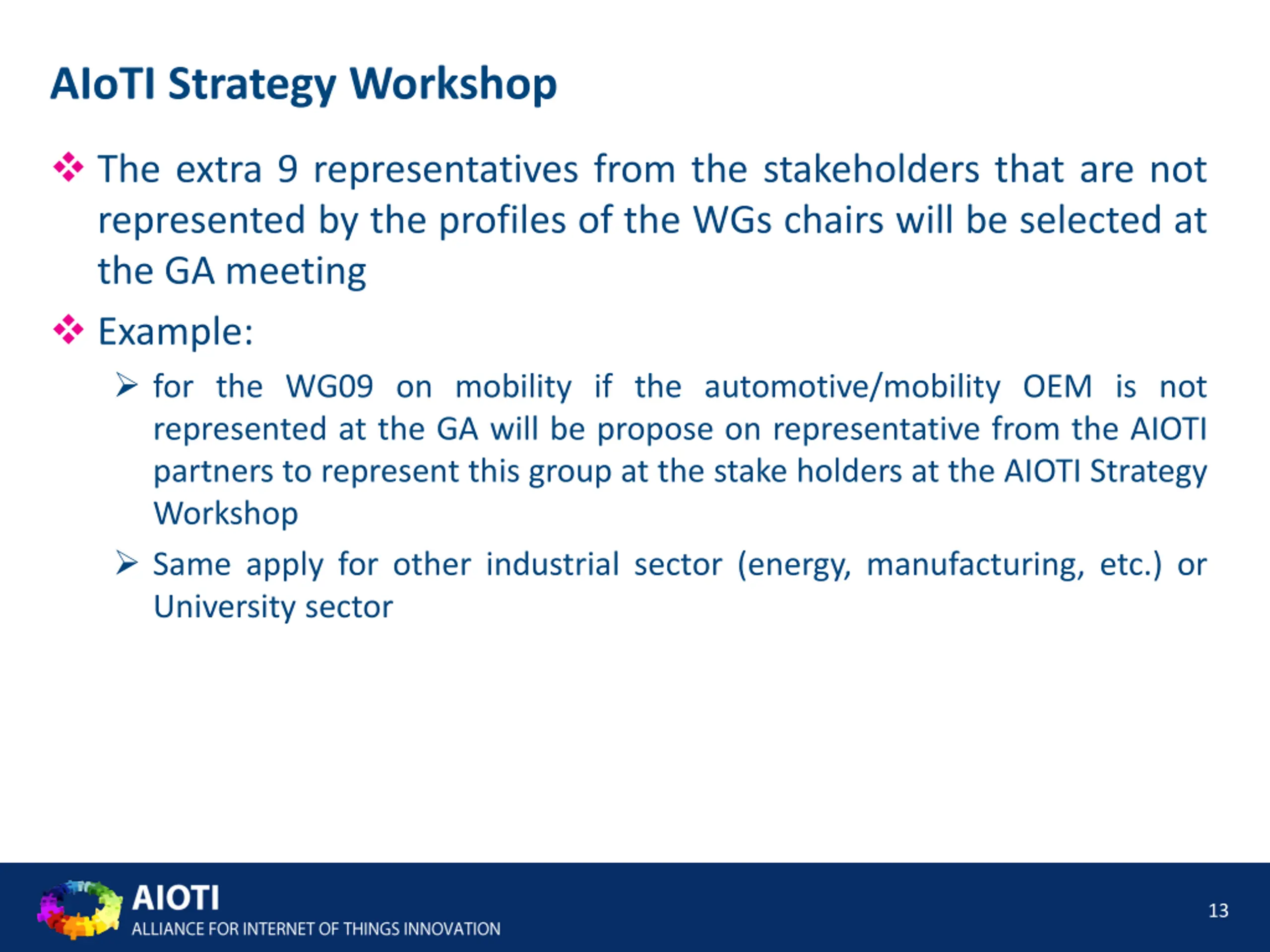 AIoTI Strategy Workshop The extra 9 representatives from the stakeholders that are not represented by the profiles of the WGs chairs will be selected at the GA meeting Example: for the WG09 on mobility if the automotive/mobility OEM is not represented at the GA will be propose on representative from the AIOTI partners to represent this group at the stake holders at the AIOTI Strategy Workshop Same apply for other industrial sector (energy, manufacturing, etc.) or University sector 13