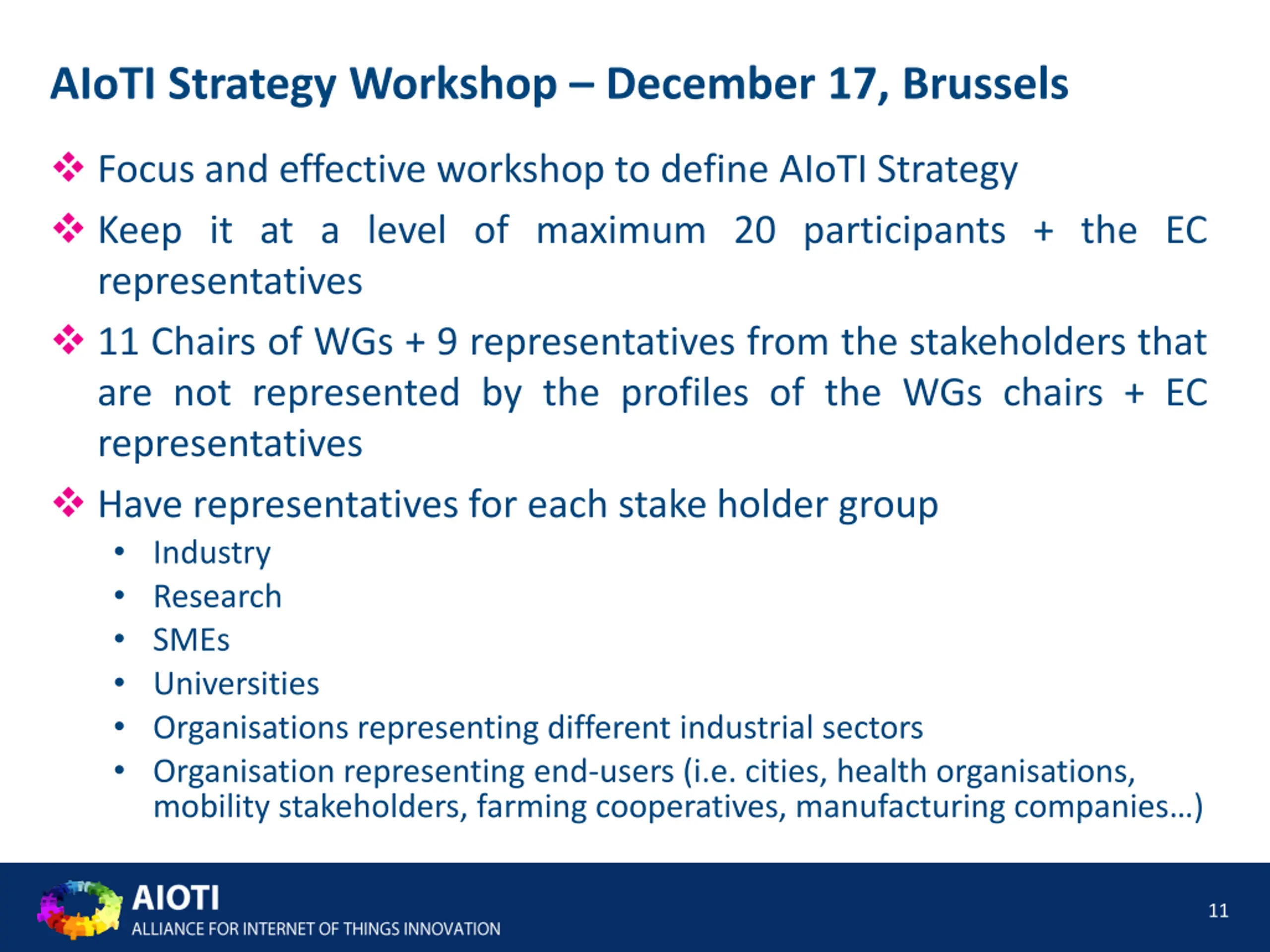 AIoTI Strategy Workshop December 17, Brussels Focus and effective workshop to define AIoTI Strategy Keep it at a level of maximum 20 participants + the EC representatives 11 Chairs of WGs + 9 representatives from the stakeholders that are not represented by the profiles of the WGs chairs + EC representatives Have representatives for each stake holder group Industry Research SMEs Universities Organisations representing different industrial sectors Organisation representing end-users (i.e. cities, health organisations, mobility stakeholders, farming cooperatives, manufacturing companies ) 11