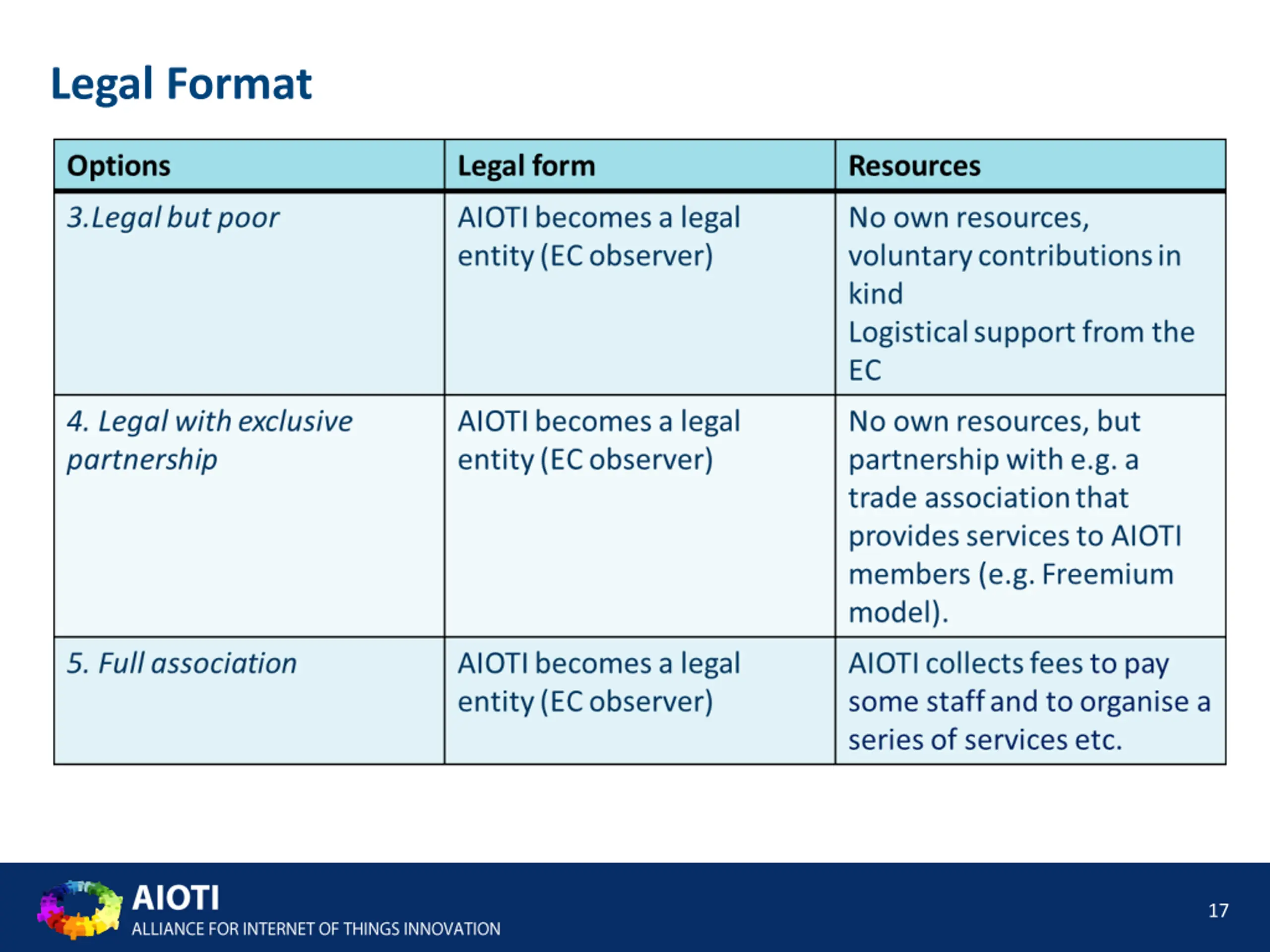 Strategy Workshop is next Stepping Stone Participation is suggested by invitation from the Board, pro- active engagement is a prerequisite; all results and discussion topics will be shared with all members of the GA and can be commented on Participants will invite DG CNCT for a de-brief session on the same day Participants are expected to prepare their input addressing the following: Intermediate organization form and end-target Level of engagement in AIoTI 2.0 Gap and stakeholder analysis Organization, structure, fees, duties and rights 6