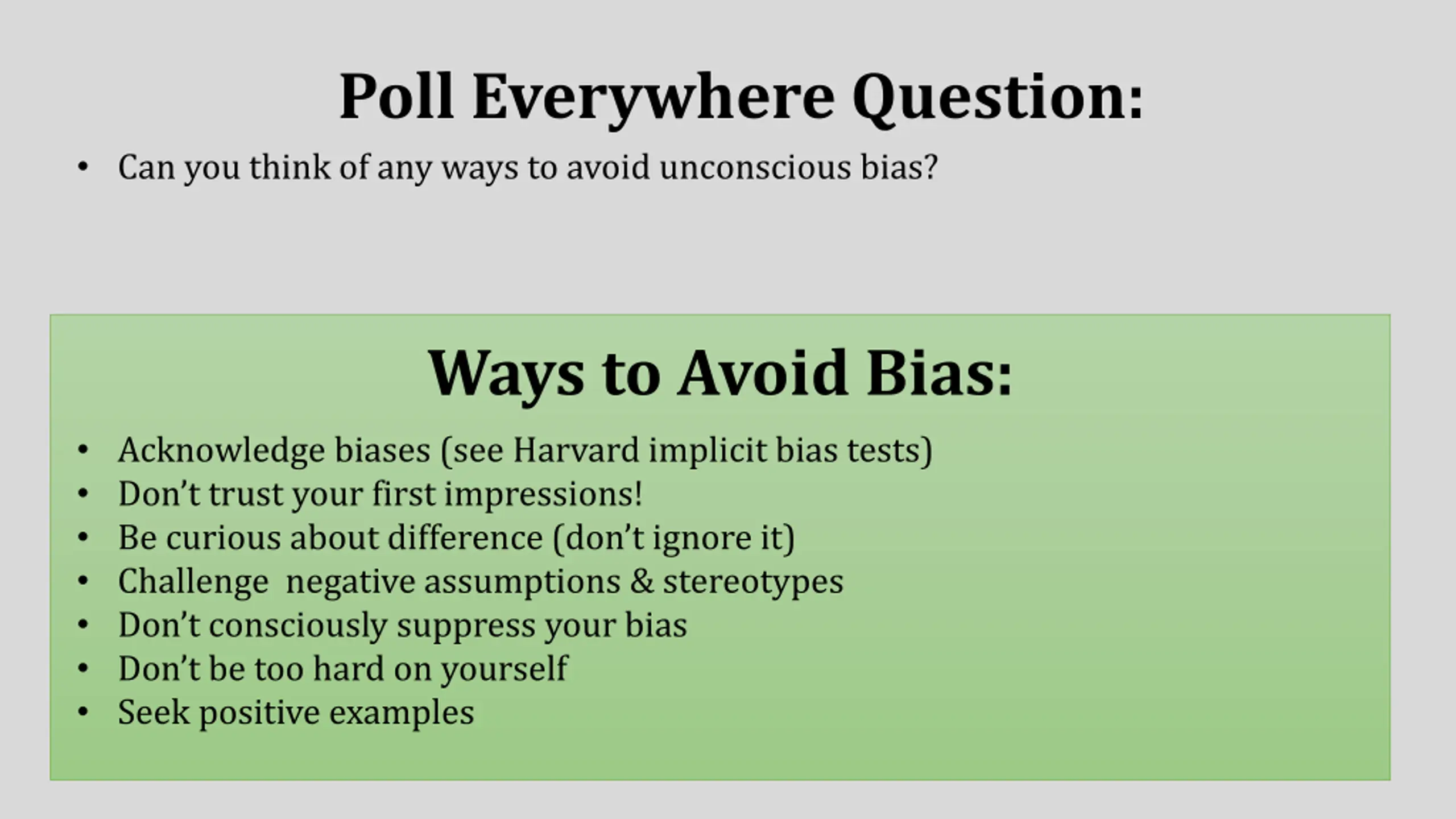 Poll Everywhere Question: Can you think of any ways to avoid unconscious bias? Ways to Avoid Bias: Acknowledge biases (see Harvard implicit bias tests) Don t trust your first impressions! Be curious about difference (don t ignore it) Challenge negative assumptions & stereotypes Don t consciously suppress your bias Don t be too hard on yourself Seek positive examples