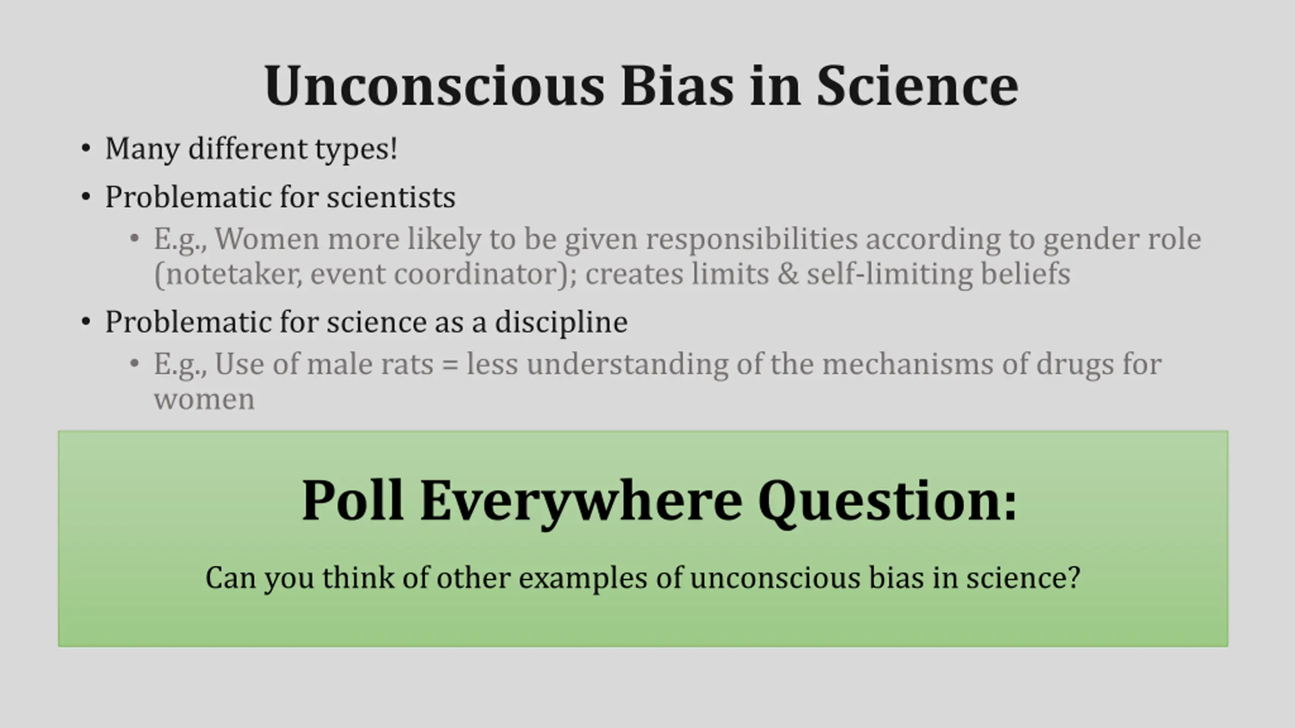 Unconscious Bias in Science Many different types! Problematic for scientists E.g., Women more likely to be given responsibilities according to gender role (notetaker, event coordinator); creates limits & self-limiting beliefs Problematic for science as a discipline E.g., Use of male rats = less understanding of the mechanisms of drugs for women Poll Everywhere Question: Can you think of other examples of unconscious bias in science?