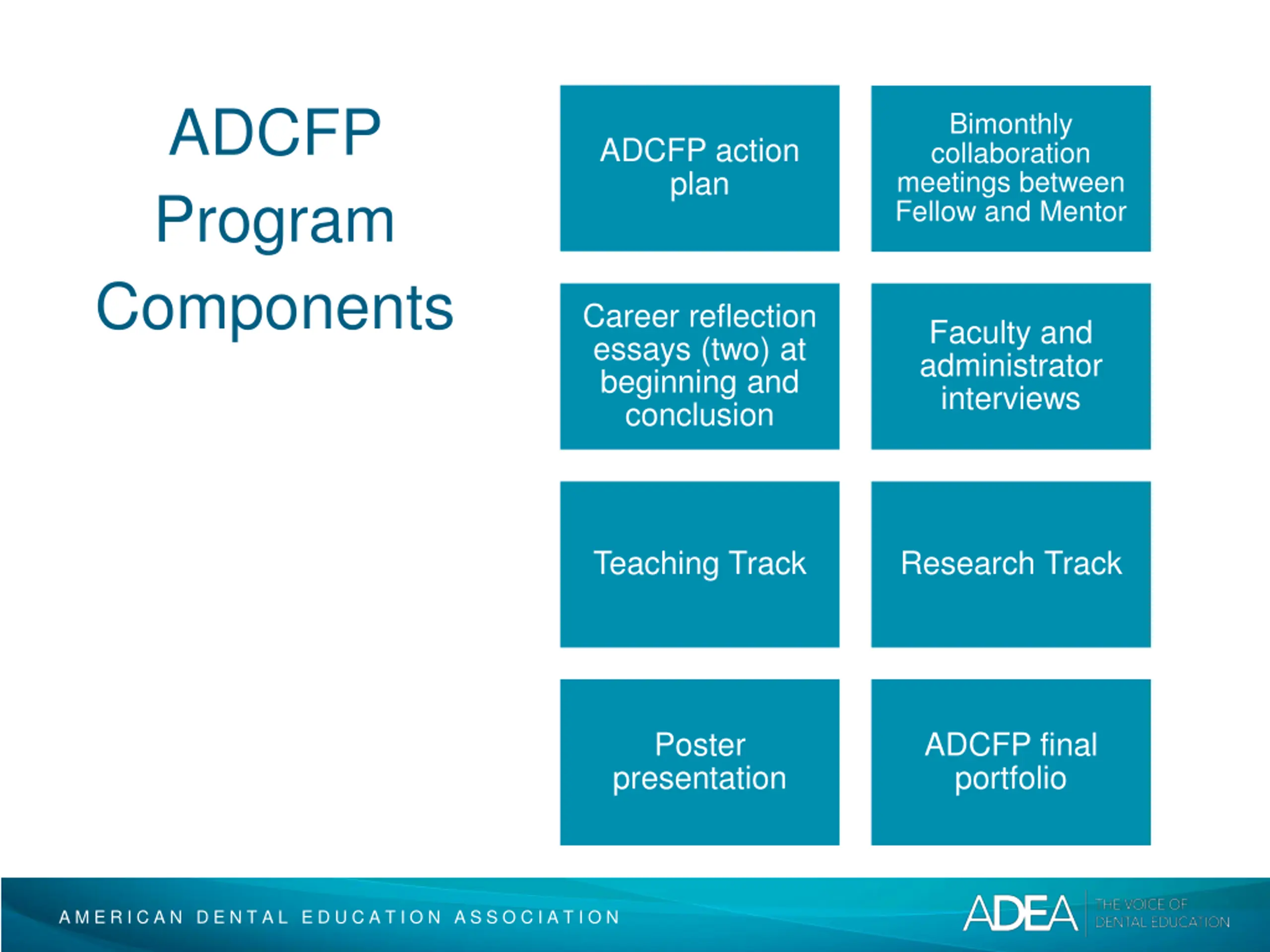 ADCFP Program Components Bimonthly collaboration meetings between Fellow and Mentor ADCFP action plan Career reflection essays (two) at beginning and conclusion Faculty and administrator interviews Teaching Track Research Track Poster presentation ADCFP final portfolio A M E R I C A N D E N T A L E D U C A T I O N A S S O C I A T I O N