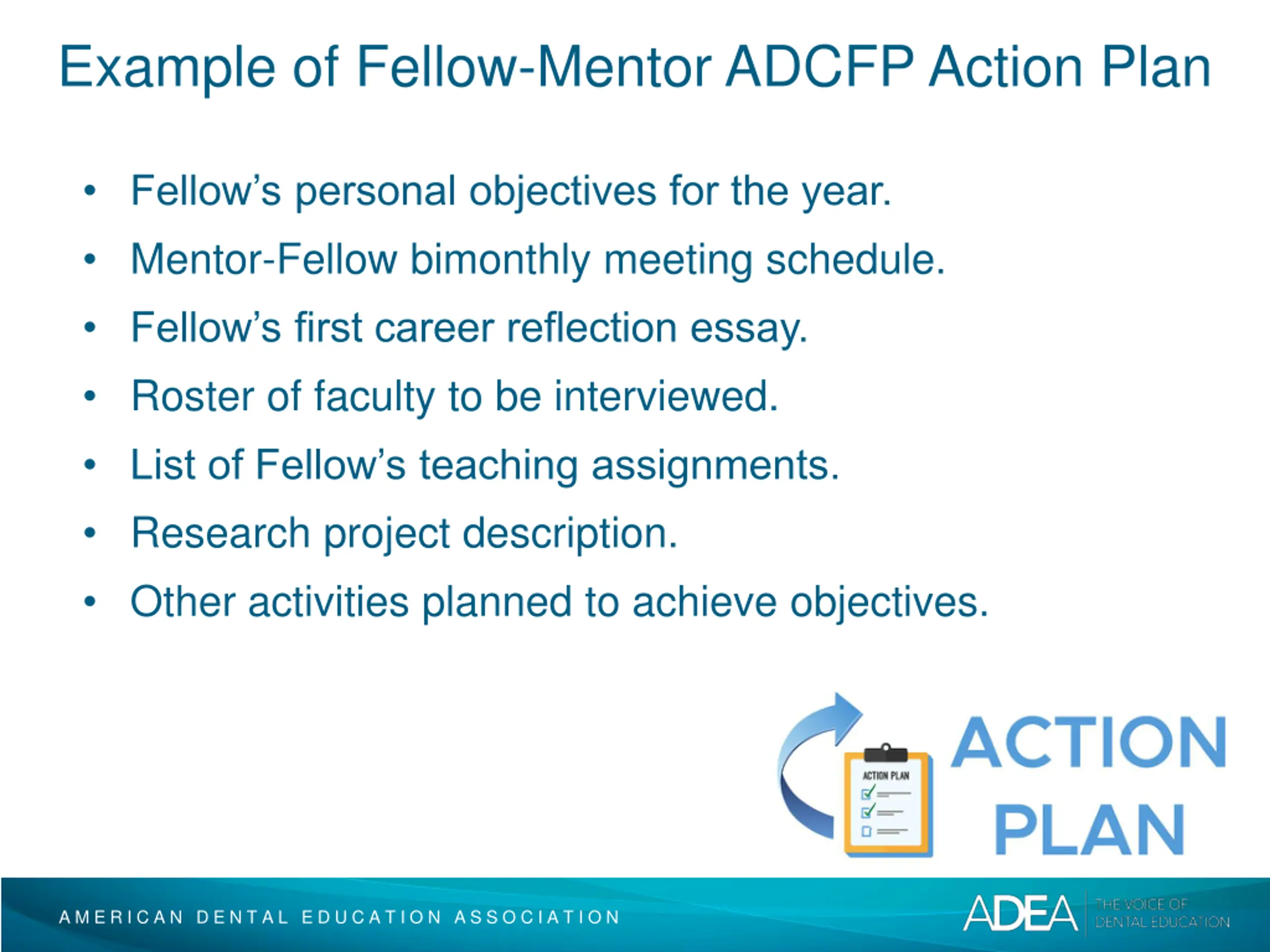 Example of Fellow-Mentor ADCFP Action Plan Fellow s personal objectives for the year. Mentor-Fellow bimonthly meeting schedule. Fellow s first career reflection essay. Roster of faculty to be interviewed. List of Fellow s teaching assignments. Research project description. Other activities planned to achieve objectives. A M E R I C A N D E N T A L E D U C A T I O N A S S O C I A T I O N