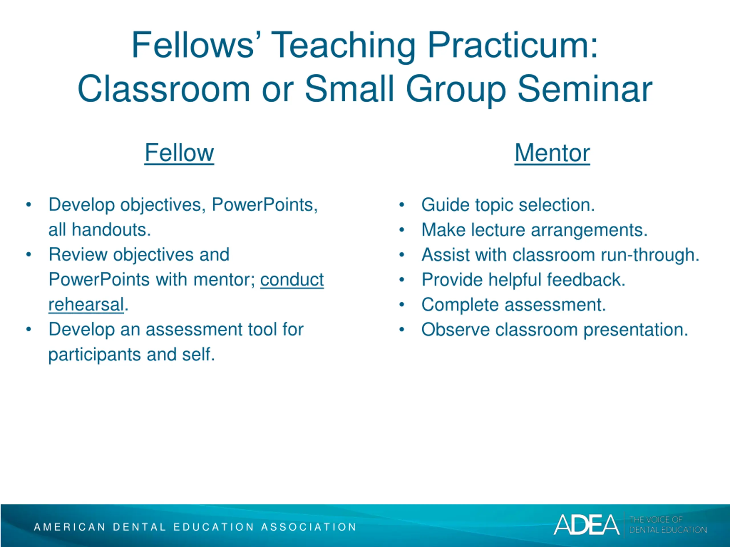 Fellows Teaching Practicum: Classroom or Small Group Seminar Fellow Mentor Develop objectives, PowerPoints, all handouts. Review objectives and PowerPoints with mentor; conduct rehearsal. Develop an assessment tool for participants and self. Guide topic selection. Make lecture arrangements. Assist with classroom run-through. Provide helpful feedback. Complete assessment. Observe classroom presentation. A M E R I C A N D E N T A L E D U C A T I O N A S S O C I A T I O N