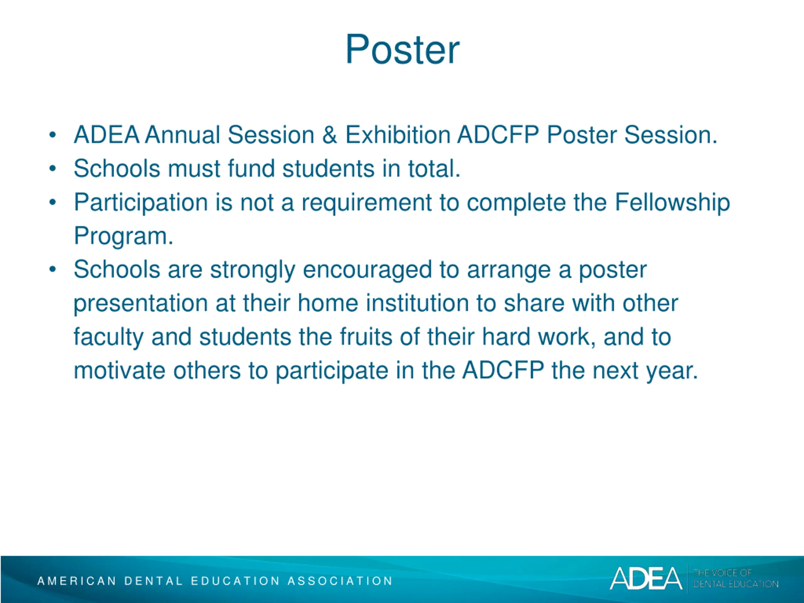 Poster ADEA Annual Session & Exhibition ADCFP Poster Session. Schools must fund students in total. Participation is not a requirement to complete the Fellowship Program. Schools are strongly encouraged to arrange a poster presentation at their home institution to share with other faculty and students the fruits of their hard work, and to motivate others to participate in the ADCFP the next year. A M E R I C A N D E N T A L E D U C A T I O N A S S O C I A T I O N